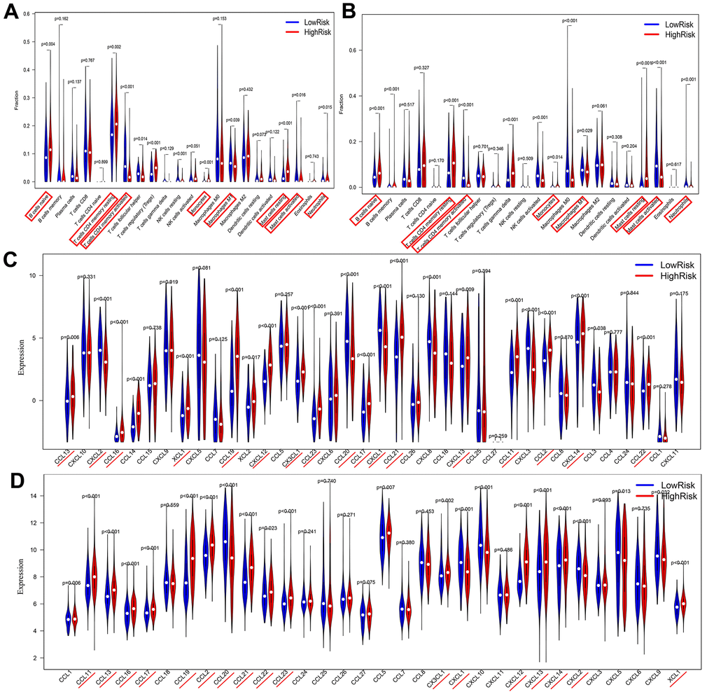 Basic data files for 22 types of immune cells and the R script for infiltration scoring were obtained from the CIBERSORT website (https://cibersort.stanford.edu/) [45]. The immune-cell infiltration score was calculated and compared between different risk groups. The immune, stromal, and the estimate score were calculated for each sample using the “estimate” package. And then we used “ggplot2” package to reveal differences in the immune score and stromal score between the high- and low-risk groups and the relationship between risk score, immune score, and the stromal score [46]. Notably, chemokines are a type of small cytokines with chemotactic functions. They guide cell migration and localization between tissues and play an important role in embryogenesis, tissue development and immune response [47]. Studies have shown that chemokines play an important role in immune cell infiltration in the tumor microenvironment (TME) [48]. Therefore, this study obtained the list of 40 human chemokines, and analyzed differences in their expression between different risk groups. Pearson correlation analysis was used to find the potential regulatory chemokine and immune cell pairs (denoted as “chemokine ~ immune cell”) based on the differentially expressed immune cells and chemokines between the 2 risk groups. Furthermore, the correlation between MIR99AHG and these chemokines was analyzed. Finally, patients were divided into two groups according to the median infiltration score of the immune cells of interest, and differences in survival between the two categories were analyzed using the KM curve.