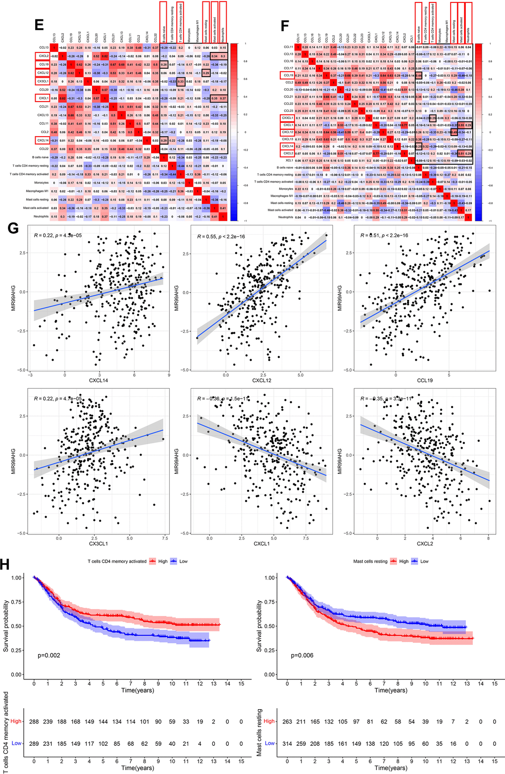 (E, F) Co-expression pattern of immune cells and chemokines in TCGA and GEO databases. (Red box represents consistent trend in both databases) (G) Correlation between MIR99AHG and chemokines of interest. (H) Survival analysis of the selected immune cells.