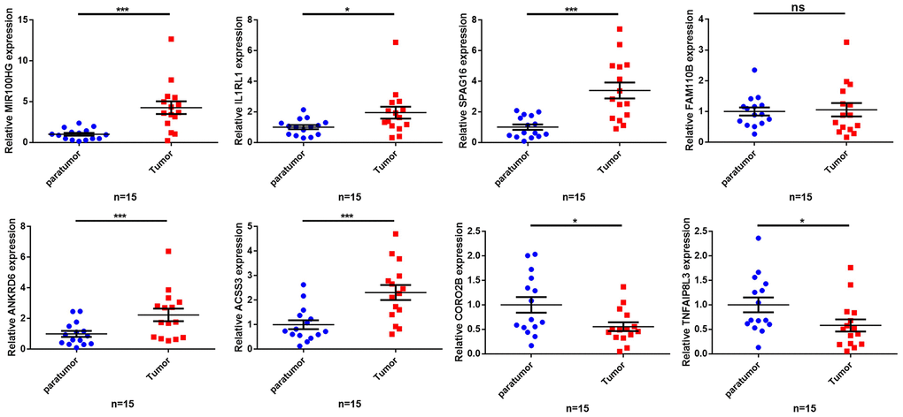 To further validate our findings, we quantified the expression levels of MIR99AHG and the crucial genes in the prognostic model (IL1RL1, SPAG16, FAM110B, ANKRD6, ACSS3, CORO2B and TNFAIP8L3) in 15 GC samples and their adjacent nontumor tissues. The PCR results revealed that MIR99AHG, IL1RL1, SPAG16, ANKRD6 and ACSS3 were upregulated in GC tissues, while CORO2B and TNFAIP8L3 were downregulated (Figure 8). There was no significant difference in the expression of FAM110B between GC samples and the corresponding nontumor tissues. Due to the limited number of high-MSI samples, additional MSIH samples are needed to verify the expression levels of the above genes in different MSI types.