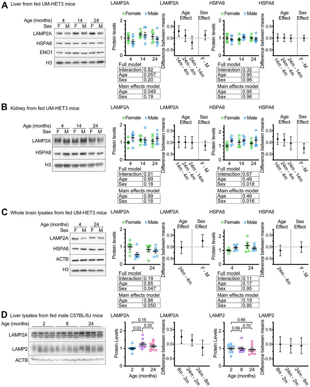 Even though male Fisher-344 rats [30] and male FVB mice [31], have age-related declines in LAMP2A in the liver, our data suggest that male C57BL/6J and male (and female) UM-HET3 mice do not have an age-related decrease in LAMP2A in the liver. Because an assessment of LAMP2A protein levels at the level of the whole tissue is not sufficient to draw conclusions about the status of chaperone-mediated autophagy, we proceeded to an evaluation of lysosome enriched fractions.