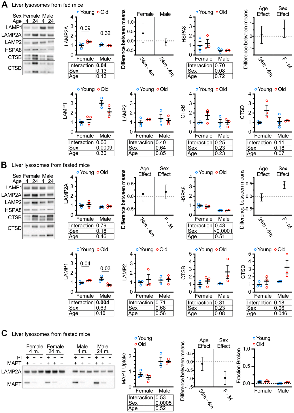 Previous studies have reported the isolation of “CMA+” and “CMA-” lysosome subpopulations from the livers of mice and rats using metrizamide-based discontinuous density gradients [46]. The light “CMA+” lysosome fraction is enriched in MTORC2 component RICTOR, and the heavy “CMA-” lysosome fraction is enriched in the MTORC1 component RAPTOR [47]. We used Histodenz-based gradients to prepare subcellular fractions of light “CMA+” and heavy “CMA-” lysosomes from the livers of ad libitum fed female and male UM-HET3 mice of ages 4 and 24 months. These gradients separated lysosomes into fractions enriched for RICTOR (CMA+) and RAPTOR (CMA-), at the expected densities, similar to previous studies using metrizamide gradients (Supplementary Figure 1). Because the light lysosome fraction is thought to be responsible for most CMA activity [46, 47], we evaluated this fraction for the abundance of key CMA proteins. We analyzed 4 μg of protein for each sample by western blot, finding no age-related change in LAMP2A, HSPA8, or total LAMP2 (Figure 2A). Previous studies have reported age-related increases in cathepsins in liver lysosomes [30]. However, the changes in the abundances of CTSB and CTSD did not reach significance in our experiments (although p = 0.07 for CTSD) (Figure 2A).