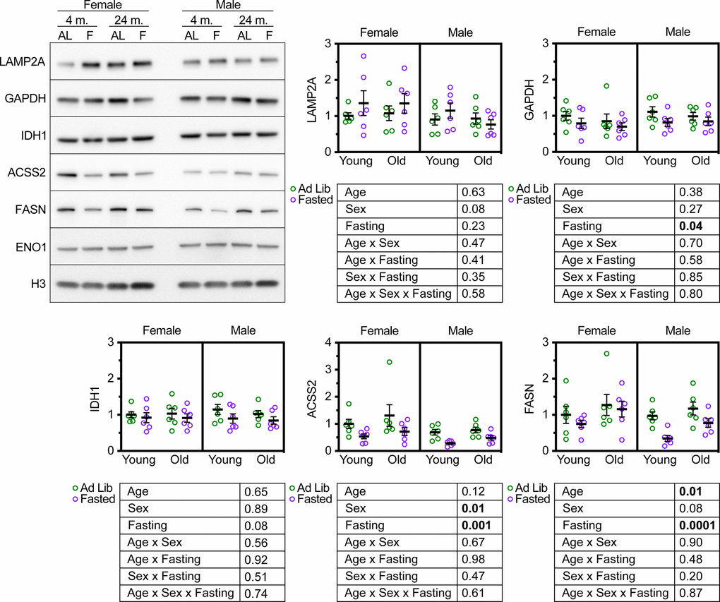 CMA is activated by fasting [20]. We reasoned that these CMA-sensitive proteins should decrease in the livers of UM-HET3 mice in response to fasting-induced CMA activation. If CMA decreases with age, then it might be the case that age will blunt the effects of fasting on the abundance of CMA-sensitive proteins. We found that fasting significantly reduced the abundance of GAPDH, ACSS2, and FASN (as predicted), and caused a near-significant reduction in IDH1 (p = 0.08) in UM-HET3 liver (Figure 3). However, age did not modify the effects of fasting on the abundance of CMA sensitive proteins (Figure 3). This result is consistent with the finding that lysosomes from 4- and 24-month-old UM-HET3 mice have equal CMA substrate uptake activity.