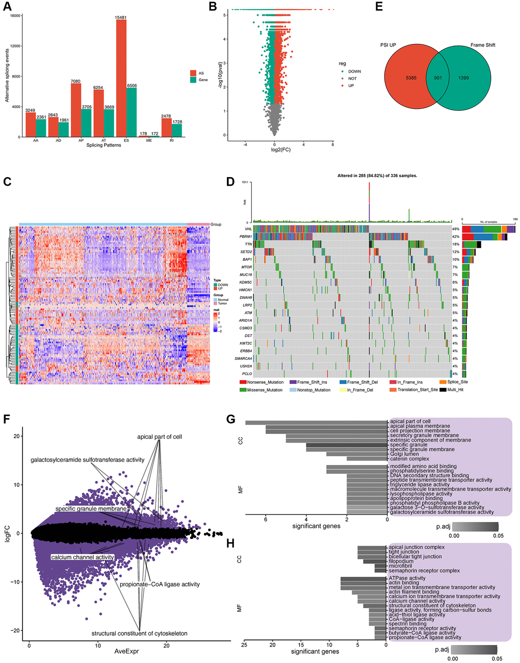 To identify the features of aberrant AS in ccRCC patients, seven AS events compared with normal samples were screened from TCGA cohort (Supplementary Figure 1A); exon skip (ES) had the highest incidence (15481), appearing in 6506 genes, followed by the alternative promoter (AP) event. In contrast, the lowest mutually exclusive exons (MEs) occurred 178 times in 172 genes (Figure 1A; Supplementary Figure 1B). A PSI value can be used to evaluate the variation of AS events; the PSI values for 11289 and 12049 AS events increased and decreased, respectively, in ccRCC patients (Figure 1B). The heatmap of PSI for the top 100 AS events is shown in Figure 1C. Gene mutations, especially splice site mutations, may lead to aberrant splicing isoforms; [22] consequently, we analyzed and visualized somatic mutations (MuTect2 variant aggregation and masking) in ccRCC patients from TCGA cohort (Figure 1D). Among the entire cohort of patients included in the database, it was observed that 49% of the patients presented with VHL gene mutations, while 42% had mutations in the PBRM1 gene [4, 23]. Importantly, within the subset of patients exhibiting mutations in either the VHL or PBRM1 gene, approximately half of them concurrently possessed mutations in both genes. Missense mutations occurred most frequently in 5689 genes, followed by frameshift deletion in 578 genes (Supplementary Figure 1C). Multiple mutations commonly occurred in one sample, and the top three mutation types were missense mutations, frameshift deletions, and nonsense mutations (Supplementary Figure 1D). The distributions of the top 10 mutated genes in all individuals and ccRCC patients are shown in Supplementary Figure 1E, 1F, respectively. Our data revealed that missense mutations and frameshift mutations occurred more frequently in patients with ccRCC.