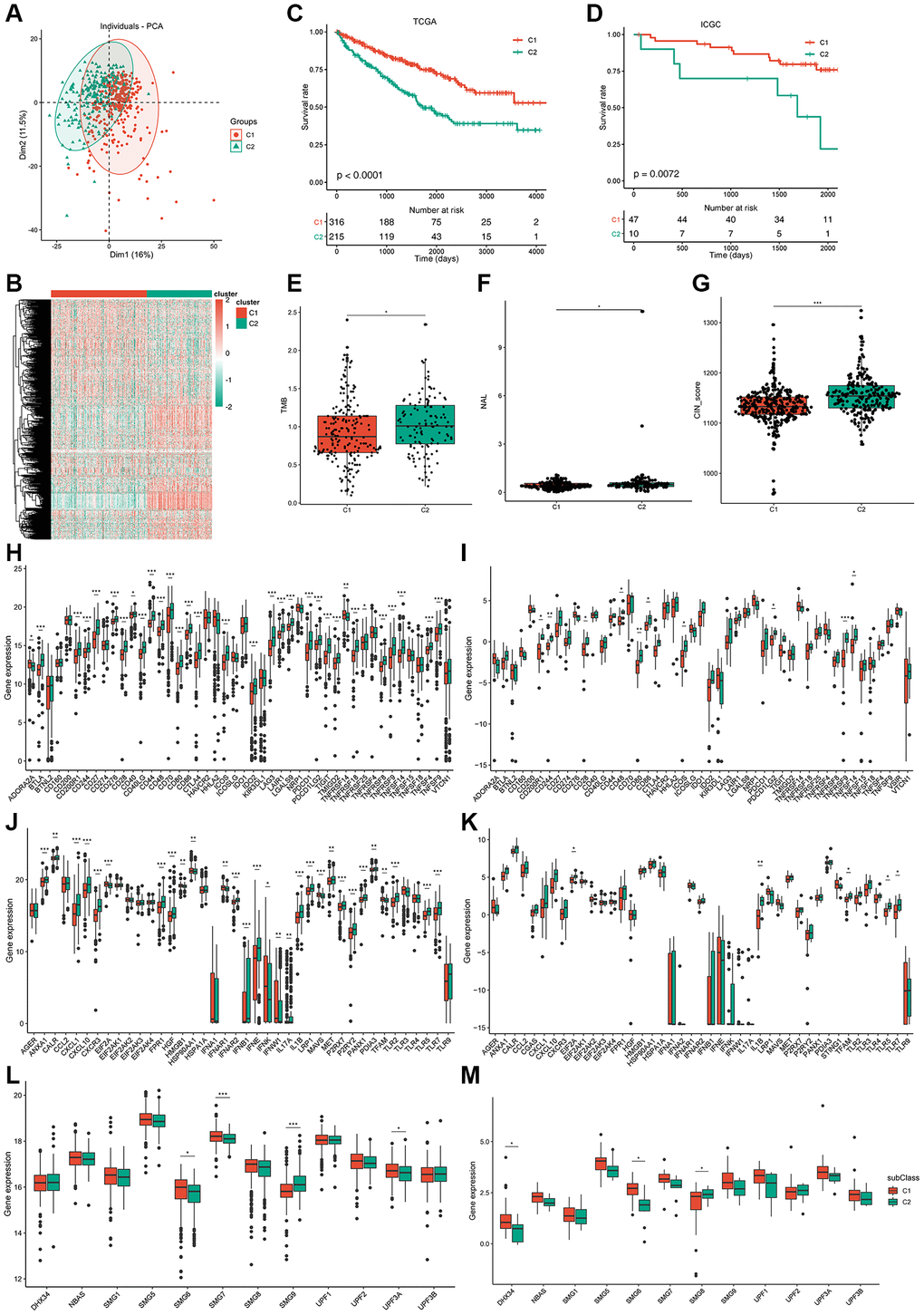 We also verified 10 ICP genes that had differential expression between the two subtypes in the ICGC cohort (Figure 4I). A total of 29 ICD factors and four NMD factors were significantly and differentially expressed between the two subtypes from TCGA cohort (Figure 4J–4L), and five ICD factors and four NMD factors were verified in the ICGC cohort (Figure 4K–4M). Therefore, reflection of the expression levels of ICP and ICD modulators can be achieved through immunotyping, which is potentially a therapeutic biomarker for mRNA vaccines.