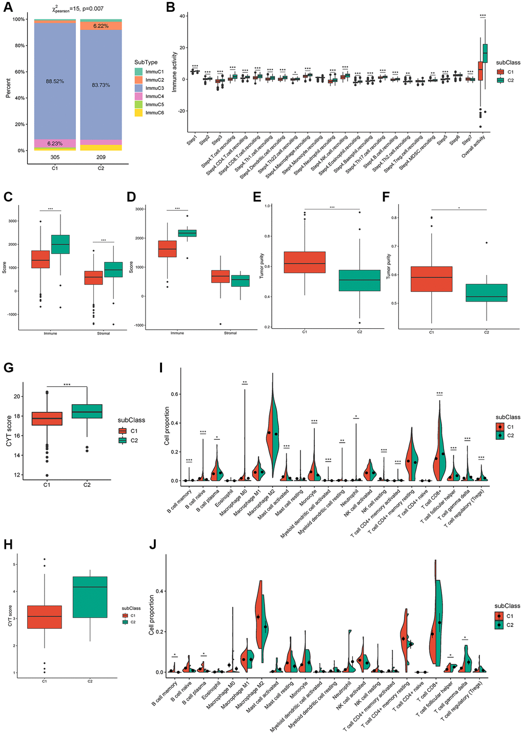 In patients, immune and stromal scores can help determine tumor purity and immune cell infiltration in the tumor microenvironment, with high immune scores indicating cytolytic good immune responses and better prognosis [33, 34]. Consistently, immune and stromal scores were remarkably higher in the C2 subtype in TCGA cohort (Figure 5C) and the immune scores of the two subtypes were verified in the ICGC cohort (Figure 5D). In addition, the tumor purity of C2 was remarkably lower than that of C1 in both TCGA and ICGC cohorts (Figure 5E, 5F). CYT reflects the cell-killing function and can be used to assess immune-mediated attacks against cancer cells; moreover, it is associated with the mutational burden [35]. The CYT score from TCGA and ICGC cohorts indicated a higher mutational burden and more complex immune microenvironment in the C2 subtype (Figure 5G, 5H). The proportion of 15 types of immune cells, comprising memory B cells, naïve B cells, plasma B cells, M0 macrophages, activated mast cells, monocytes, activated myeloid dendritic cells, resting myeloid dendritic cells, neutrophils, resting natural killer calls (NKCs), activated CD4+ memory T cells, CD8+ T cells, follicular helper T cells, gamma delta T cells, and regulatory T cells (Tregs) was remarkably different between the two subtypes in TCGA cohort (Figure 5I). Although memory B cells, plasma B cells, follicular helper T cells, and gamma delta T cells were verified in the ICGC cohort, some other immune cell types, such as CD8+ T cells, resting NKCs, and activated CD4+ memory T cells showed the same trend (Figure 5J). These results indicated that patients with the C2 subtype had a significant tumor infiltration of CD8+ T cells, [27] suggesting that these patients were more suitable for our mRNA vaccine. Taken together, these results suggest that the immune subtypes are promising candidates for mRNA vaccines, and patients with C2 tumors with/without an immunosuppressive microenvironment are potentially more suitable for mRNA vaccination.