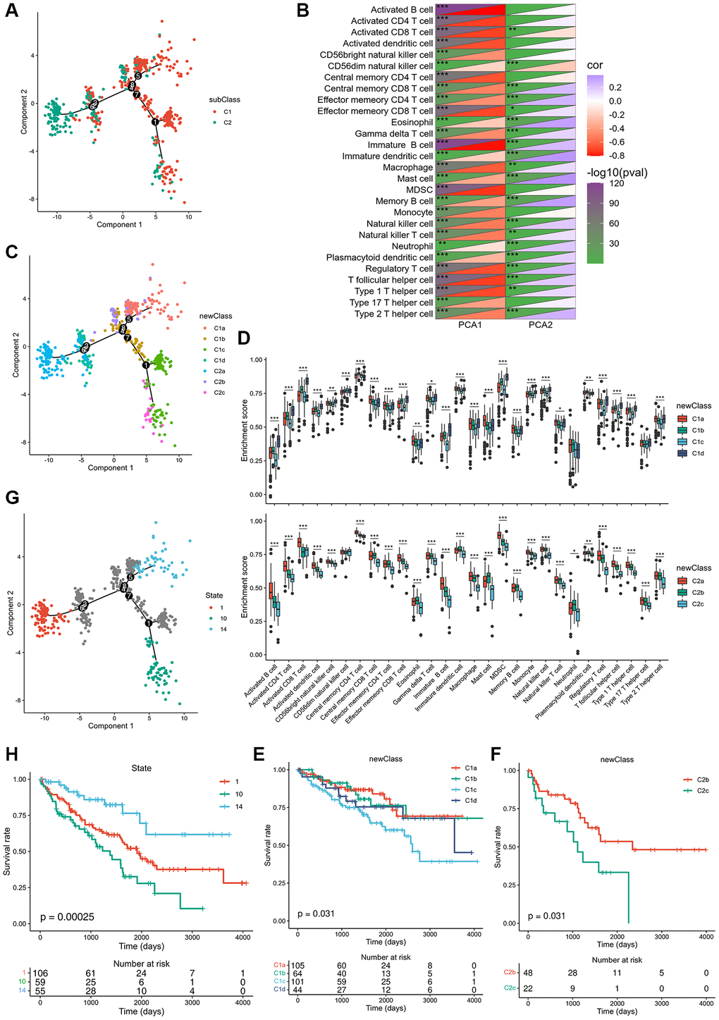 The immune landscape of ccRCC was created from 28 immune cell types of pan-cancer gene expression profiles using ssGSEA and monocle (Figure 6A). C1 integral distribution was opposite to that of C2. The correlation between PCA1/2 and 28 types of pan-cancer immune cells is shown in Figure 6B. The pan-cancer immune cells did not show any positive correlation with PCA1 expression. Nevertheless, activated and immature B cells, myeloid-derived suppressor cells, and T follicular helper cells were the most negatively correlated immune cells. Immature dendritic cells, mast cells, and memory B cells showed the highest positive correlation with PCA2. Moreover, differential distribution was displayed in the same subtype, indicating significant intra-cluster heterogeneity within the subtypes. Based on the location of immune cell populations, C1 was further divided into four subsets defined as C1a, C1b, C1c, and C1d, and C2 was further divided into three subsets separately defined as C2a, C2b, and C2c (Figure 6C). The enrichment score of several immune cells showed significant difference between every subset (Figure 6D). C1c and C2c showed lower enrichment scores for most immune cells, such as activated B cells, activated CD4 T cells, activated CD8 T cells, central memory CD8 T cells, effector memory CD4 T cells, effector memory CD8 T cells, and memory B cells, suggesting that patients with these subsets may be more suitable for mRNA vaccination. C1a subtype patients showed the highest survival rates, while subtypes of C1c and C2c showed the worst survival rates (Figure 6E, 6F). In addition, samples that showed utmost immune landscape distribution positions were compared in terms of prognosis, and the probability of survival was the best in a group 14 of patients, consistent with the aforementioned results (Figure 6G, 6H). Taken together, the immune landscape based on immune subtypes can be used for identification of immune components of each ccRCC patient and prediction of their prognoses and can preferably be used to provide a personalized mRNA vaccine therapy.
