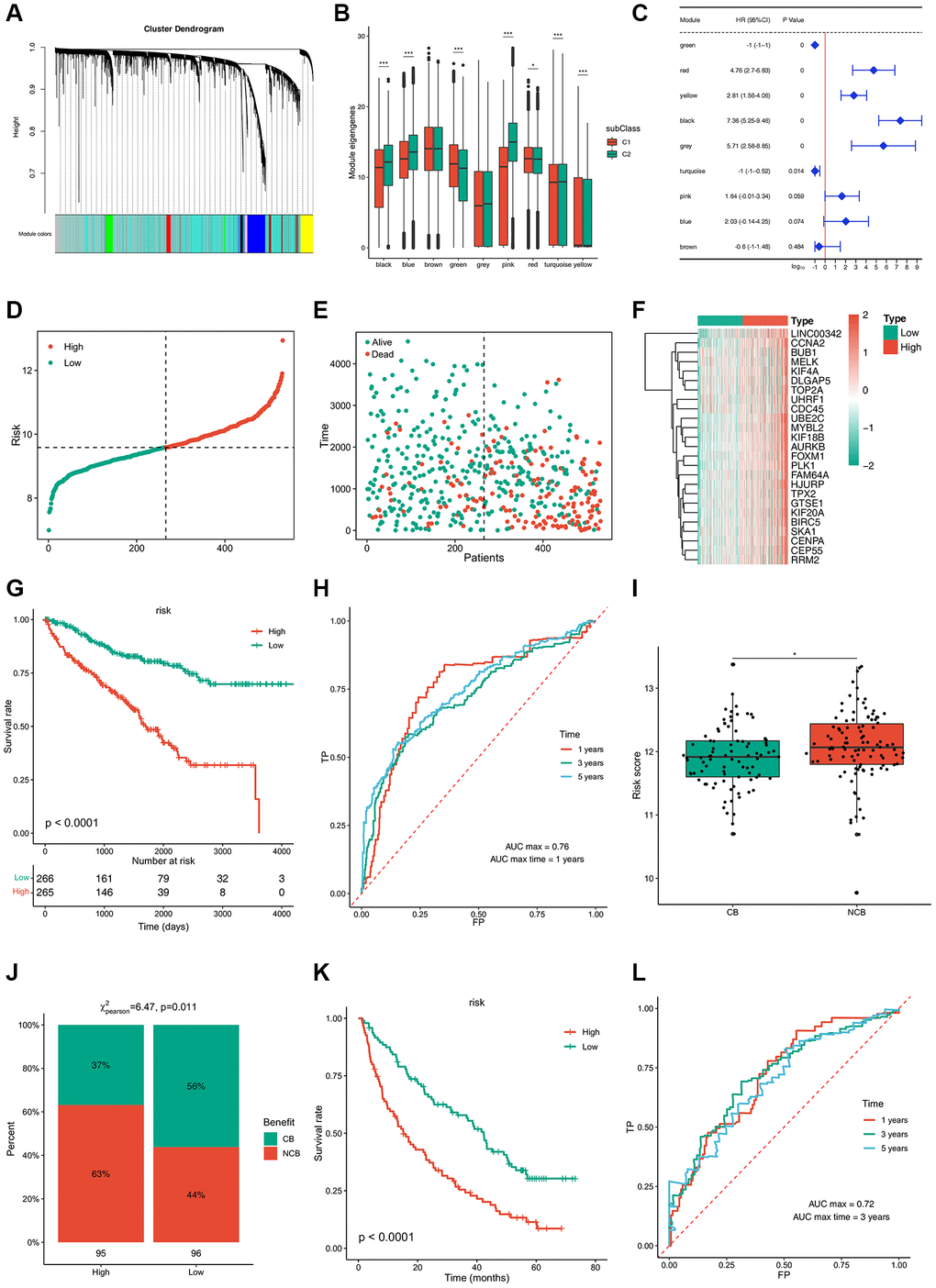 A risk estimation model was established to predict tumor risk according to the expression of 25 hub genes that were obtained from prognostic modules (Figure 7D–7F). Low-risk patients showed a better survival rate (Figure 7G). The time-dependent receiver operating characteristic (ROC) curve suggested that this model can accurately predict the 1- to 5-year survival rate of ccRCC patients (Figure 7H). Thus, this model can be used to identify patients who can benefit from mRNA vaccines through risk scoring and provide a reference for immunotherapy. Next, 592 patients treated with programmed cell death protein 1 (PD-1) blockade were divided into clinical benefit (CB) and no clinical benefit (NCB) groups; NCB patients showed a higher risk score (Figure 7I). In contrast, 56% of patients with CB were concentrated in the low-risk group, while 63% of patients in the high-risk group had a poor survival rate (Figure 7J, 7K). The time-dependent ROC curve suggested that this model can accurately predict 1- to 5-year survival rate of ccRCC patients treated with PD-1 blockade (Figure 7L). Collectively, these results provide evidence for the accuracy of the risk prediction model, based on which, more patients can benefit from mRNA vaccines.