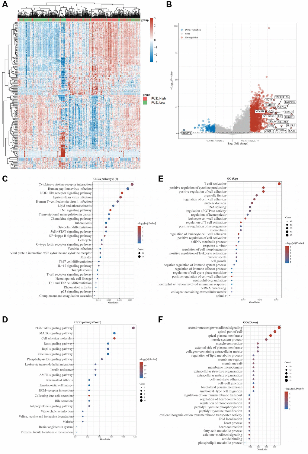 We next analyzed the KIRC data from TCGA database and conducted the heatmap to compare the differentially expressed genes (DEGs) (Figure 2A). The volcano plots of DEGs were visualized between the cancer and normal tissues, and the value of log2(fold changes) above 1.2 or below −1.2 was defined as the threshold for the differential mRNA expression (Figure 2B). In total, 9708 DEGs were picked up ultimately, with 7324 up-regulated and 2384 down-regulated (table not shown). Noticeably, the results showed that the expression of genes, including PUS1, PUS7L, RPUSD2, PUS10, RPUSD4, TRUB1, and DKC1, was increased, while conversely, the expression of some genes was decreased, such as PUSL1 (Figure 2B). To uncover the potential biological processes involved, we next performed the Gene Ontology (GO) analysis and obtained the enrichment for several cancer pathways of DEGs, which particularly focused on cell-cell adhesion and cytokine production, and intriguingly, results also suggested that pathways on immune related activity in T-cell activation were involved (Figure 2C, 2D). Similarly, we further conducted the Kyoto Encyclopedia of Genes and Genomes (KEGG) pathway enrichment analysis with the figure portraying several notable signal pathways, which included PD-1 checkpoint, PD-L1 expression and cell cycle (Figure 2E, 2F).