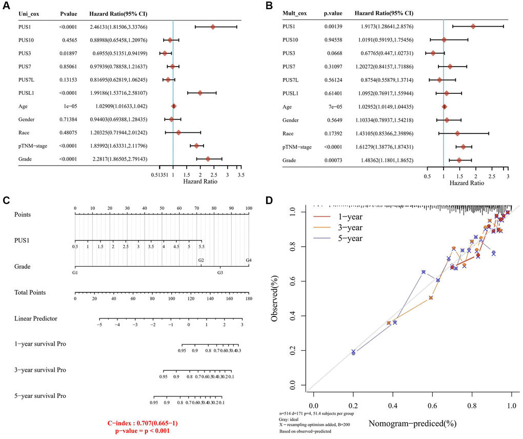 We further conducted Univariate and multivariate cox regression analysis to identify the proper terms to build the nomogram as described previously [21]. The forest showed the P value, HR and 95% CI of PUS1, age, gender, TNM stage and grade by “forestplot” R package. Multivariate cox proportional hazards analysis was used to develop a nomogram to predict 1-year, 3-year and 5-year overall recurrence. Based on the nomogram’s points associated with each risk factor, an individual patient’s risk of recurrence can be calculated by “RMS” R package.