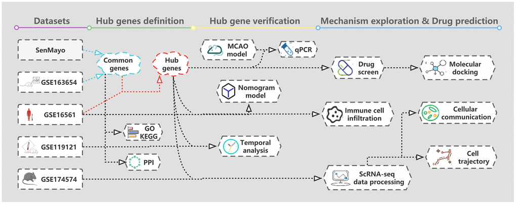 Identifying senescent cells in vivo remains challenging, although cellular senescence can drive a variety of age-related disease manifestations through aging-related secretory phenotypes. Recently published gene sets related to senescent cells can aid in identifying in vivo cellular senescence [16]. Moreover, senescence can vary significantly in different cell types. The senescence of endothelial, smooth muscle and immune cells is believed to participate in the senescence of blood vessels, and the senescence of immune cells is believed to promote the aging of other cell types [17, 18]. Additionally, the senescence of neurons and glial cells is widespread in neurodegenerative diseases [19]. However, few studies have examined cellular senescence after IS, and there is a lack of research on the relationship between cellular senescence and a wide range of cell types in the brain. In this study, we identified hub genes for cellular senescence in IS using bioinformatics and experimental validation and explored their biological pathways. Using single-cell RNA sequencing (scRNA-seq), we evaluated the hub senescence-related gene (HSRG) expressions in various cell types and mapped the developmental trajectories of microglia and cellular communication networks. Finally, we predicted potential therapeutic drugs based on the HSRGs. The approach used in this study is depicted in the flow diagram (Figure 1).
