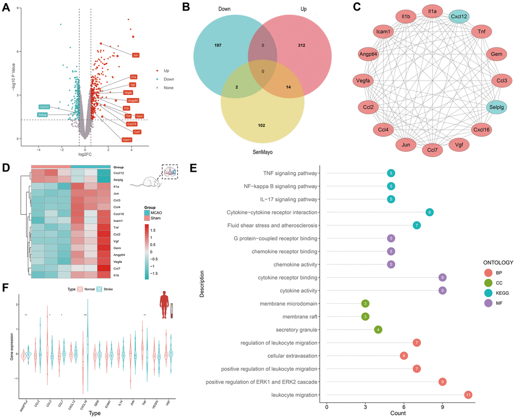 SenMayo is a recently published gene set that includes 125 and 118 unrepeatable genes in humans and mice, respectively [16]. The gene set was downloaded from the supplementary information of the original article. The Gene Expression Omnibus (“ http://www.ncbi.nlm.nih.gov/geo/”) is an open-source database that provides gene expression profiles for our study. Four datasets including GSE163654, GSE16561, GSE119121, and GSE174574 were used (Table 1). Bulk RNA-sequencing (bulk RNA-seq) of brain tissue from three sham-operated rats and three middle cerebral artery occlusion (MCAO) rats in GSE163654 was used for differential expression analysis. GSE16561 contains bulk RNA-seq data of peripheral blood from 39 patients with IS and 24 patients with normal groups, which were used for expression and immune cell infiltration analyses. GSE119121 contains bulk RNA-seq data from rat peripheral blood from the MCAO and sham groups used for the temporal analysis of gene expression. Finally, scRNA-seq data of the brain tissue from GSE174574 with three sham group mice and three MCAO group mice were processed and used for cell communication analysis.