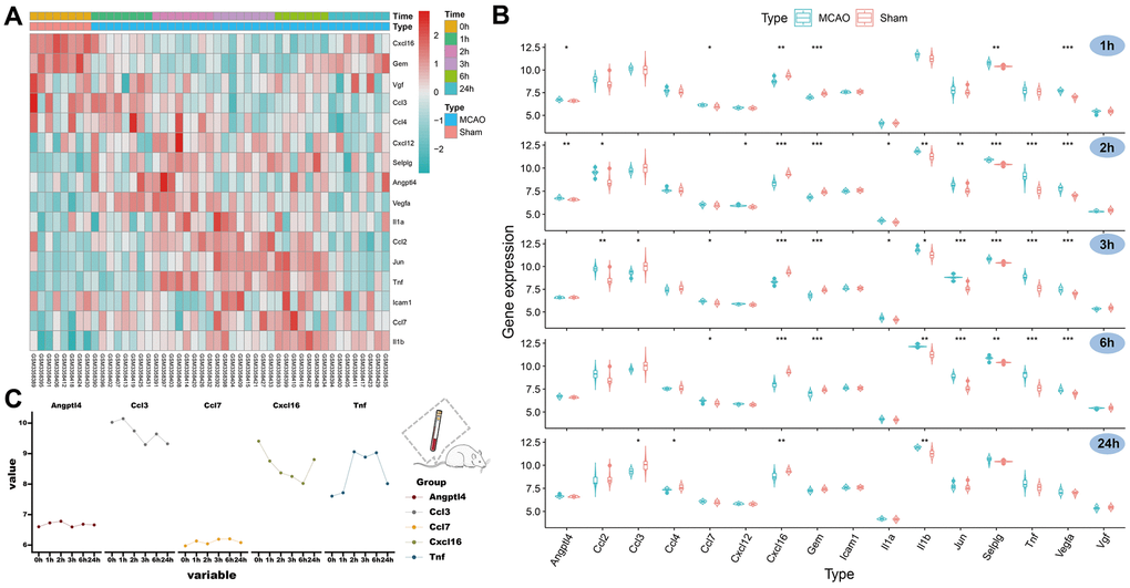 By analyzing the GSE119121 expression matrix, we visualized the expression of these 16 SRGs in the peripheral blood of the MCAO and sham groups (Figure 3A). We further compared the expression trends of these SRGs at five different time points (1, 2, 3, 6, and 24 hours) (Figure 3B). Notably, CXCL16 expression and GEM decreased in the MCAO group but tended to recover after 24 hours. The expression levels of VGF, CCL3, and CCL4 decreased at later time points. Meanwhile, the expression levels of the other 11 genes increased at different time points within 24 hours in the MCAO group, and most of them recovered 24 hours after the operation. Additionally, the expression of five SRGs was significantly different at some points after the MACO operation compared with that before the operation. Finally, a line graph was drawn to describe the variation trends of the five hub genes (Figure 3C). Thus, ANGPTL4, CCL3, CCL7, CXCL16, and TNF have better species conservation in the peripheral blood of rats and humans and were identified as HSRGs for further research.