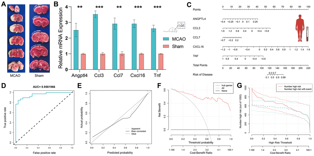 We performed RT-qPCR in the MCAO model to demonstrate the critical role of HSRGs in IS. To verify the success of our MCAO model, TTC staining was performed on the brain tissue of MCAO rats (Figure 4A). TTC staining stains the normal brain tissue red, while the infarct lesions appear white, allowing a good evaluation of the infarct in the brain. According to the RT-qPCR results, the expression levels of all five genes differed significantly (p <0.05) (Figure 4B). Gene expression levels were higher in the brain tissues of rats in the MCAO model than in the sham group, and the expression trend was consistent with that shown in Figure 2D between the MCAO and sham groups in GSE163654.