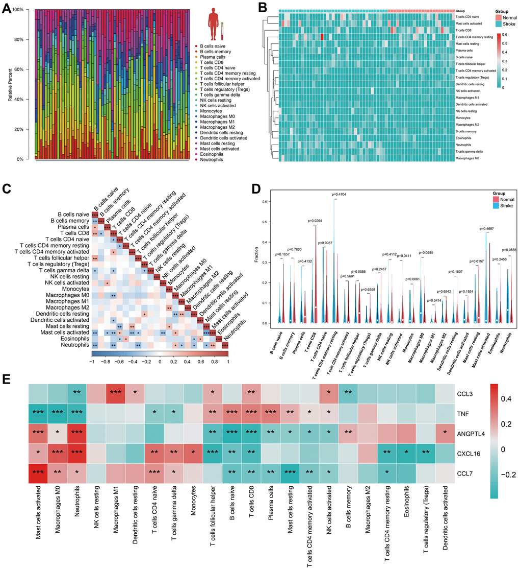 The CIBERSORT algorithm was used to predict immune cell infiltration in the IS and normal groups. The bar plot and heatmap displayed the percentage of each of the 22 types of immune cells in each human blood sample from GSE16561 (Figure 5A, 5B). Correlation analysis of immune cells revealed that resting mast cells and activated mast cells had the most significant negative correlation, while naïve B cells and CD8 T cells, follicular helper cells, resting mast cells and activated CD4+ memory T cells, M2 macrophages and monocytes, resting dendritic cells and M1 macrophages, neutrophils and activated mast cells had a significant positive correlation (Figure 5C). The violin plot of the immune cell infiltration difference showed that, in comparison to the normal group, patients with IS had lower levels of CD8+ T cells and activated NK cells (Figure 5D). Finally, we analyzed HSRG expression in 22 types of immune cells (Figure 5E).