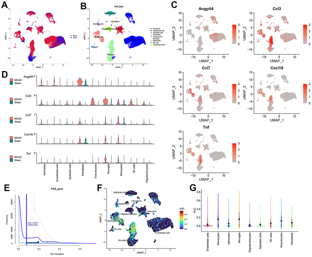 Cell clusters were identified by UMAP analysis in MCAO and sham-operated mice (Figure 6A). We further annotated the cell clusters through the “SingleR” package and mapped them to the UMAP (Figure 6B). Nine cell clusters were identified: astrocytes, endothelial cells, epithelial cells, fibroblasts, granulocytes, microglia, monocytes, natural killer cells, and oligodendrocytes. Subsequently, HSRG expression in each cell cluster was mapped onto UMAP diagrams and quantified (Figure 6C, 6D). Finally, we used the “AUCell” package to evaluate the total hub gene expressions in all types of cells and cells with an AUC value greater than 0.078 were adopted (Figure 6E). Significantly, HSRGs were highly expressed in microglia and monocytes (Figure 6F). Based on the UMAP and violin plots, microglia and monocytes had the highest senescence scores, as shown in Figure 6G.