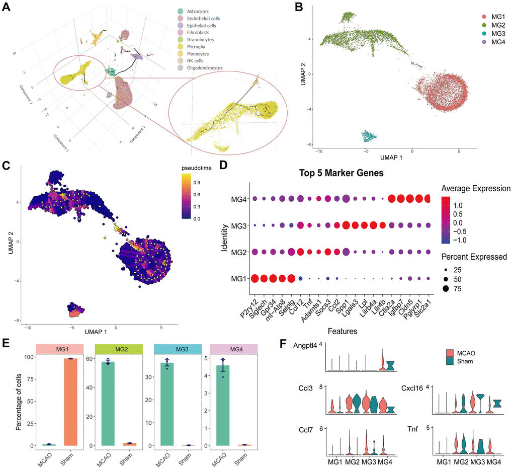 The cell trajectories of the microglia are presented as 3D images in Figure 8A. Individual clustering and UMAP mapping showed that microglia were divided into four clusters (Figure 8B). To annotate these microglial cell sub-clusters, we identified the top five cell marker genes in each cluster (Figure 8D). The marker genes include “P2RY12”, “SIGLECH”, “GPR34”, “mt-ATP8”, “SELPLG” of MG1, “CCL12”, “TNF”, “ADAMTS1”, “SOCS3”, “CCL2” of MG2, “SPP1”, “LGALS3”, “LPL”, “LILRB4A”, “LILR4B” of MG3, and “CTLA2A”, “IGFBP7”, “CLDN5”, “PGLYRP1”, “SLC2A1” of MG4. Analysis of the differences in the number of cell clusters showed that MG1 was the main microglia in the sham group, whereas MG2, MG3, and MG4 were the main microglia in the MCAO group (Figure 8E). Additionally, ANGPTL4 showed specificity for MG4, and its expression was higher in the MCAO group. In MG2-4, CCL7, CXCL16, and TNF were highly expressed in the MCAO group. Although CCL3 was expressed in different subgroups, its expression level was higher in the MCAO group (Figure 8F). Finally, the cell trajectory of microglia was determined to explore their divergent trajectory.