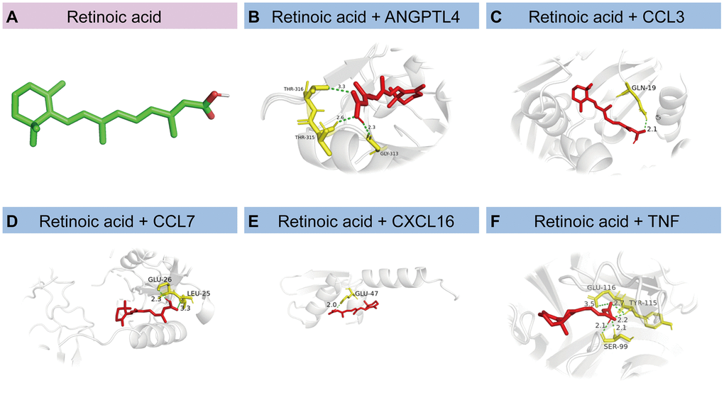 Small-molecule compounds that may bind to ANGPTL4, CCL3, CCL7, CXCL16, and TNF were identified using the DSigDB database; the top 10 compounds are listed in Table 3. Among these, retinoic acid had the highest combined score (608812). We then drew a structural diagram of retinoic acid, which can bind to ANGPTL4, CCL3, CCL7, CXCL16, and TNF (Figure 9A–9F).