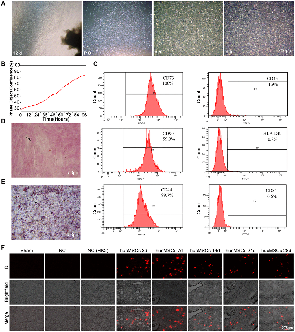 Light microscopy, IncuCyte S3 instrument detection, flow cytometry, and osteogenesis and adipocyte induction were performed to identify whether the isolated cells are hucMSCs. After 12 days of primary cultivation, the scattered transparent cells developed around the tissue block. The cells gradually became spindle and fused into pieces. The tissue block was removed, and the cells were called generation P0. The transparent dots gradually became long, and their number gradually increased. On the 9th day after the tissue block adhered to the wall, spindle cells gathered around the tissue block. On the 12th day, the cells around the tissue block fused into pieces (Figure 1A). The real-time growth of the third generation of cells was monitored using an IncuCyte S3 instrument. The growth curve showed that the cells grew well (Figure 1B). Flow cytometry was performed to measure the level of surface markers on the cells. The result showed that the cells expressed CD73, CD90, and CD44 but not CD34, CD45, and human leukocyte antigen DR HLA-DR, (Figure 1C). Osteogenic differentiation, which indicates the formation of bone matrix, was detected by alizarin red staining (Figure 1D). Adipogenesis differentiation was determined by Oil Red O staining, and numerous intracellular lipid droplets were observed (Figure 1E). Finally, hucMSCs were labeled with a cell membrane dye Dil, and then the labeled cells were injected into the mice via the tail vein. The fluorescence signals of lung section were captured after 3, 7, 14, 21, 28 days of treatment. The results showed that remarkable fluorescence signals were recorded in the lung of mice, indicating the strong targeting ability of hucMSCs to lung. Although the number of surviving stem cells decreased at a certain period after hucMSCs injection into the mice, some viable hucMSCs were still present on the 28th day after hucMSCs treatment (Figure 1F). The above data elucidated that hucMSCs were successfully cultured and they can be retained in the lungs.