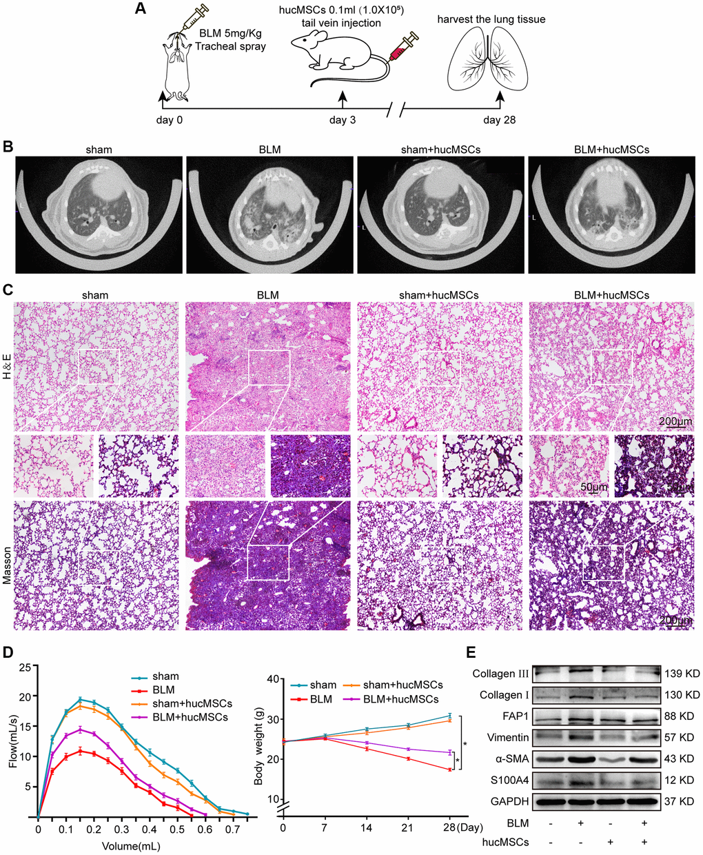 The antipulmonary fibrotic effect of hucMSCs treatment was assessed in vivo and in vitro. hucMSCs were injected into the mice through the tail vein after 3 days of bleomycin (BLM) spraying (Figure 2A). MicroCT images showed that the lungs of BLM-treated mice had evident honeycomb lung and uneven patchy shadows. These fibrotic symptoms were dramatically attenuated under hucMSCs treatment (Figure 2B). H&E and Masson staining results revealed that compared with those in BLM group, the collagen deposition was reduced and the alveolar structure was clear and complete in hucMSCs-treated group (Figure 2C). Lung function testing showed that the forced vital capacity (FVC) of hucMSCs-treated mice was improved. Body weight monitoring reflected that hucMSCs treatment suppressed the body mass loss compared with that in the sham mice (Figure 2D). Western blot analysis clarified that hucMSCs repressed the expression of fibrotic proteins such as α-SMA, vimentin, collagen I, and collagen III. Differentiation-related proteins, including S100 calcium binding protein A4 (S100A4) and fibroblast activation protein alpha (FAP1), were also inhibited by hucMSCs (Figure 2E). The above data indicated that hucMSCs treatment alleviated pulmonary fibrosis in vivo.