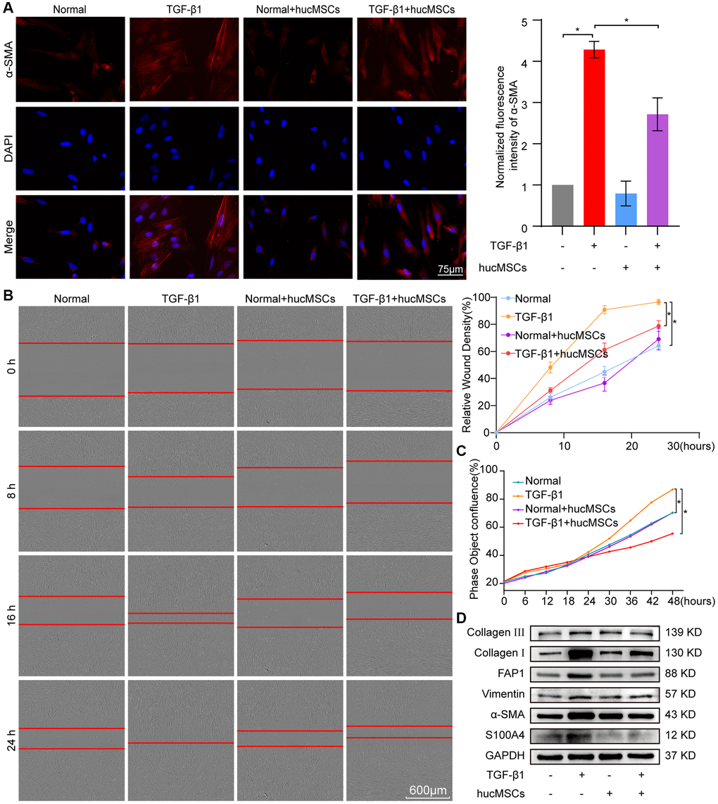 The transforming growth factor-beta 1 (TGF-β1) activates human embryonic lung fibroblast (MRC-5) to differentiate into myofibroblast. Hence, this system was used as a cell model to further explore the role and mechanism of hucMSCs treatment against pulmonary fibrosis. Immunofluorescence staining showed that the cells became spindle shaped and revealed an increase in a-SMA in the TGF-β1 group. hucMSCs treatment repressed a-SMA expression (Figure 3A). Cell proliferation and migration were monitored using an IncuCyte S3 instrument, and the result showed that both processes were repressed by hucMSCs treatment compared with those in TGF-β1 treatment (Figure 3B, 3C). Western blot analysis elucidated that the levels of FAP1, S100A4, α-SMA, vimentin, and collagen I and III were decreased by hucMSCs treatment (Figure 3D). The above data indicated that hucMSCs treatment blocked pulmonary fibrogenesis in vitro.