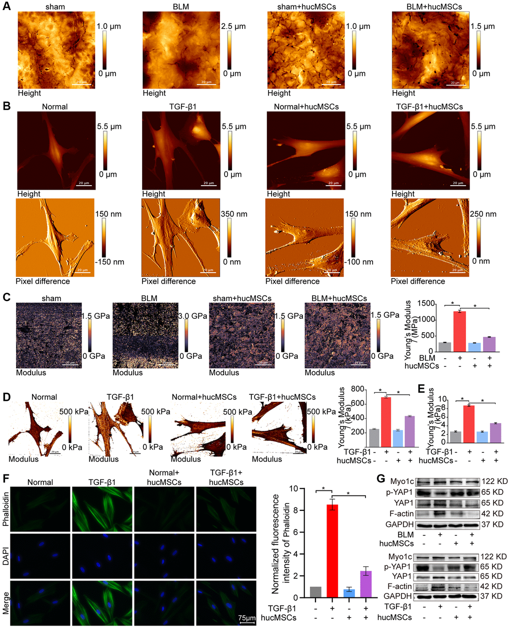 Finally, the effect of hucMSCs on cell/tissue stiffness and cytoskeleton tension was analyzed by atomic force microscopy (AFM), cytoskeleton staining, and Western blot. AFM was employed to examine the cell/tissue stiffness in response to hucMSCs treatment. AFM images exhibited that the lung tissues in the sham group had a smooth surface. BLM caused the lung surface to become rough and increase the lung tissue thickness. Meanwhile, hucMSCs treatment improved the lung tissue morphology (Figure 4A). AFM cell images displayed that the cells were spindle shaped with smooth surface in the normal group. After TGF-β1 stimulation, the cells became elongated and flat and the cell height/crudeness increased. hucMSCs treatment improved the cell state. Stress fibers arranged in parallel along the main axis of cells were found in the TGF-β1 group. After hucMSCs intervention, these fibers were reduced (Figure 4B). Young’s modulus value, also known as tensile modulus, was calculated from the displacements of boundary tissues and the force distribution expressing the changes of mechanical stiffness obtained using the AFM. Young’s modulus values revealed that the force measurement increased in the BLM/TGF-β1 group compared with that in the sham/normal group. In addition, hucMSCs treatment decreased the Young’s modulus (Figure 4C, 4D). Tests using colloid probe with ball stuck pressed cells were conducted to determine the reaction forces of cells. The reaction forces increased in the TGF-β1 group, and the reducing effect of hucMSCs treatment on the reaction forces was better than the TGF-β1 action (Figure 4E). Cytoskeleton tension was observed by FITC-phalloidin staining under a fluorescence microscope. The images indicated that the cytoskeleton tension was increased by TGF-β1 and decreased by hucMSCs treatment (Figure 4F). YAP is a sensor of the structural and mechanical features of the cell microenvironment, such as cellular stiffness, stretching, density, or confined adhesiveness [17, 18]. Force applied to the nucleus directly drives YAP nucleocytoplasmic shuttling via phosphorylation or dephosphorylation [19]. Our data showed that hucMSCs decreased YAP1 expression and increased p-YAP1 expression, suggesting that this treatment reduced the mechanical forces by blocking YAP1 nuclear entry. Myosin 1c (Myo1c) can sense cellular mechanical properties and function as a tension-sensitive anchor or transporter [20]. As an important component of cytoskeleton, F-actin is involved in cytoskeleton tension. The results showed that the expression of Myo1c and F-actin increased in pulmonary fibrosis in vivo and in vitro but was reduced by hucMSCs treatment (Figure 4G). The above data indicated that the stiff environment of fibrogenesis caused the cells to establish a mechanical connection between the cytoplasm and nucleus, initiating the expression of related mechanical genes such as Myo1c and F-actin. hucMSCs treatment blocked the force transmission and reduced the mechanical force by blocking YAP1 nuclear entry.