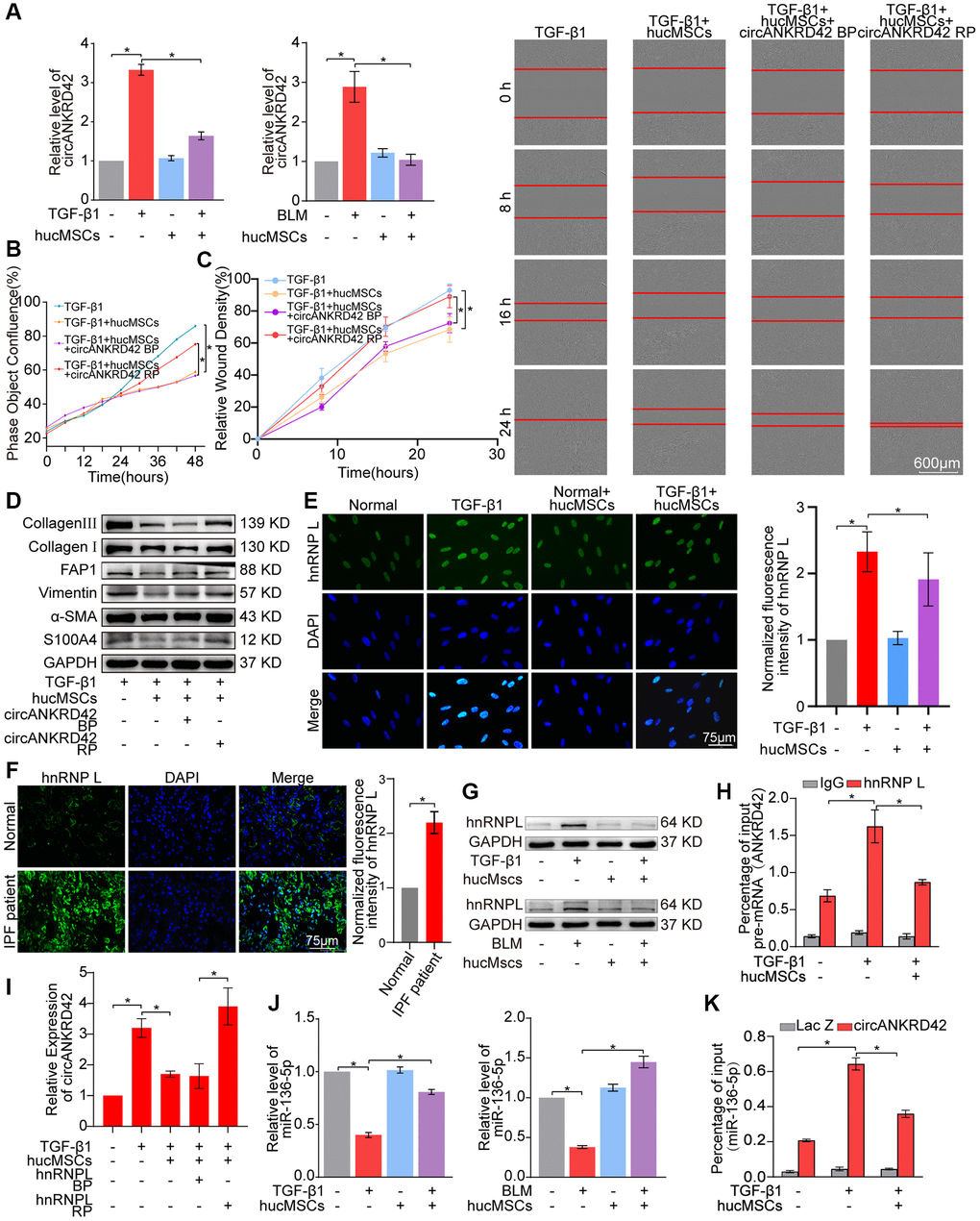 qRT-PCR was performed to prove that the regulatory mechanism of hucMSCs treatment is via the upstream circANKRD42-miR-136-5p of YAP1. The results verified that hucMSCs treatment enhanced miR-136-5p expression compared with TGF-β1/BLM (Figure 5J). RNA antisense purification analysis showed that miR-136-5p was enriched in circANKRD42. This enrichment was further intensified by TGF-β1 but was decreased by hucMSCs treatment (Figure 5K), indicating that hucMSCs treatment depended on circANKRD42-miR-136-5p signal pathway in vitro.