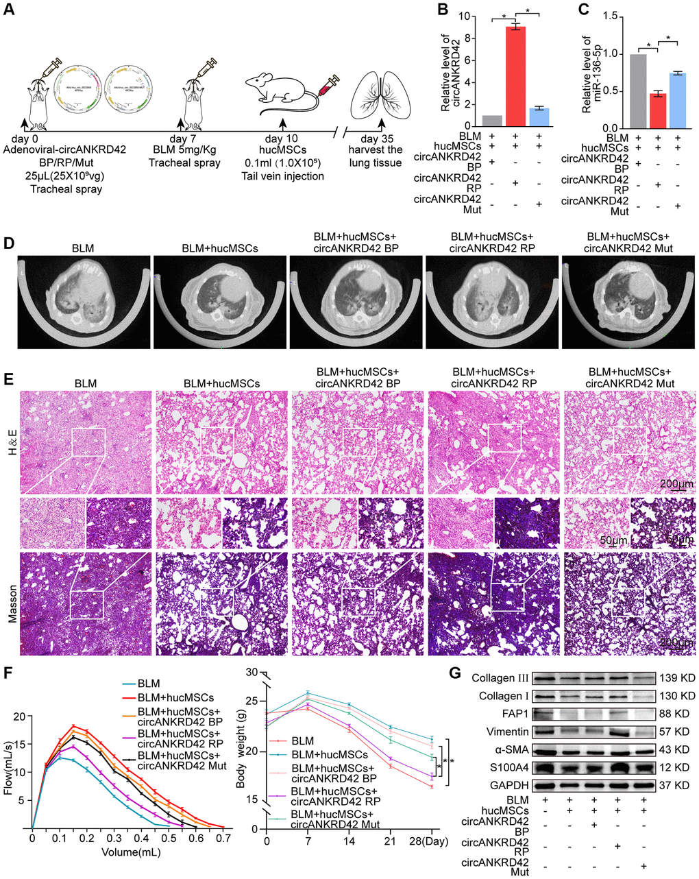 C57BL/6 male mice aged 8 weeks, with an average body weight of 22 ± 3 g, were purchased from Jinan Pengyue Experimental Animal Breeding Company (Jinan, China). According to the experimental requirements, the mice were randomly divided into different groups (10 mice in each group) using a simple random allocation method: sham, bleomycin (BLM), sham+hucMSCs, BLM+hucMSCs treatment, and BLM+hucMSCs+circANKRD42 blank plasmid (BP)/ recombinant plasmid (RP)/mutation (Mut) group. The BLM group was administered 5 mg/kg BLM which was sprayed into the lungs using a Penn-Century MicroSprayer (Penn-Century Inc., Wyndmoor, PA, USA), while the sham group was sprayed with the same amount of saline. The BLM+hucMSCs+circANKRD42 BP/RP/Mut group mice were administered 25 × 109 vg adenoviral-circANKRD42 BP/RP/Mut which was also sprayed into the lungs using a Penn-Century MicroSprayer. About 0.1 mL hucMSCs (1.0 × 105) were injected into mice through the tail vein in the hucMSCs treatment group after three days of BLM spraying. On the 28th day of modeling, the lung changes of all mice were evaluated by a MicroCT imaging system for small animals (PerkinElmer, USA). Mice were anesthetized by intraperitoneal injection of 2.5% Avertin (0.25 g/kg). Then, lung samples were collected, processed and stored for the following experiments. Experiments on the animals were approved by the Animal Experiments Ethics Committee of Binzhou Medical University Hospital (No. 20200128-19).