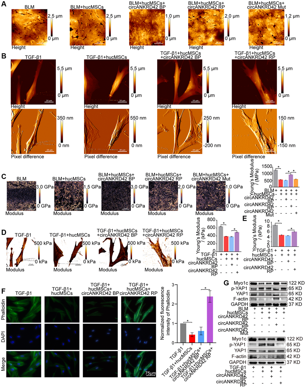 Rescue experiments were performed to prove that hucMSCs treatment reduces mechanical stiffness by regulating circANKRD42–miR-136-5p–YAP1 signal pathway in vivo and in vitro. AFM images depicted that BLM caused the roughness of the lung surface and the thickening of the lung tissues. hucMSCs treatment improved the lung tissue morphology, but this therapeutic effect was reversed by overexpressed circANKRD42. The effect of circANKRD42 mutation on lung tissues was weaker than that of overexpressed circANKRD42 (Figure 7A). Stress fibers arranged in parallel along the main axis of cells were found in the TGF-β1 group. After hucMSCs intervention, these fibers were reduced. Overexpressed circANKRD42 reversed the effect of hucMSCs treatment on fibers (Figure 7B). In terms of Young’s modulus, hucMSCs treatment decreased the force compared with that in the BLM/TGF-β1 group, but overexpressed circANKRD42 reversed the effect of hucMSCs treatment on the force. The effect of circANKRD42 mutation on force was weaker than that of overexpressed circANKRD42 (Figure 7C, 7D). Tests using colloid probe with ball stuck pressed cells were conducted to determine the reaction forces of cells based on Young’s modulus. The result showed that hucMSCs treatment decreased the reaction forces of cells compared with those in the TGF-β1 group, but overexpressed circANKRD42 reversed the effect of hucMSCs treatment on the force measurement (Figure 7E). Cytoskeleton staining showed that hucMSCs treatment reduced the cytoskeleton tension compared with that in the TGF-β1 group, and overexpressed circANKRD42 reversed the effect of hucMSCs treatment on the cytoskeleton tension (Figure 7F). Mechanical stiffness-related proteins such as YAP1/p-YAP1, Myo1c, and F-actin were measured by Western blot in vivo and in vitro. The same results were obtained from the cell model and animal model. hucMSCs treatment inhibited the expression levels of YAP1, Myo1c, and F-actin and promoted p-YAP1 expression. circANKRD42 overexpression increased the expression of YAP1, Myo1c, and F-actin and decreased p-YAP1 expression, thus reversing the effect of hucMSCs treatment. The effect of circANKRD42 mutation on these proteins was weaker than that of overexpressed circANKRD42 (Figure 7G).