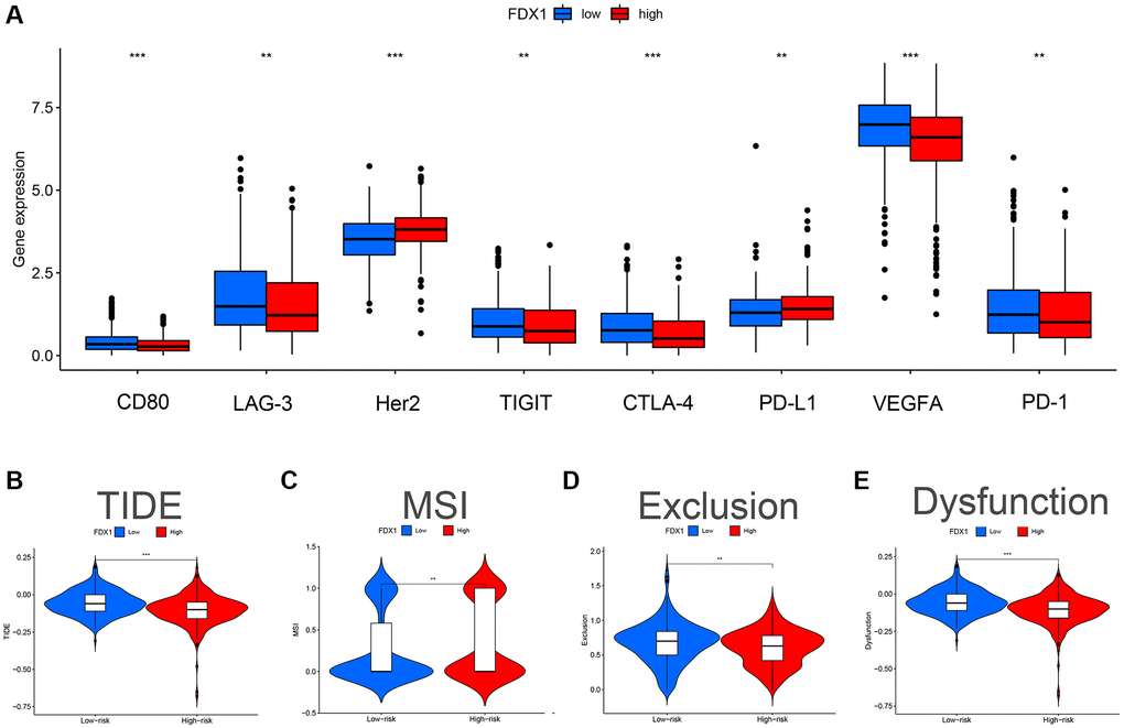 We evaluated the differences in common immune cells (ICs) between the FDX1 high- and low-expression groups, including programmed cell death 1 (PD1/PDCD1), programmed cell death ligand 1 (PDL1/CD274) and cytotoxic T lymphocyte antigen 4 (CTLA4). Our results showed that most ICs were upregulated (Figure 10A) in the low-expression group. Furthermore, a higher Tumor Immune Dysfunction and Exclusion (TIDE) score was obtained in the low-expression group, demonstrating stronger immune dysfunction and immune resistance (Figure 10B–10E).