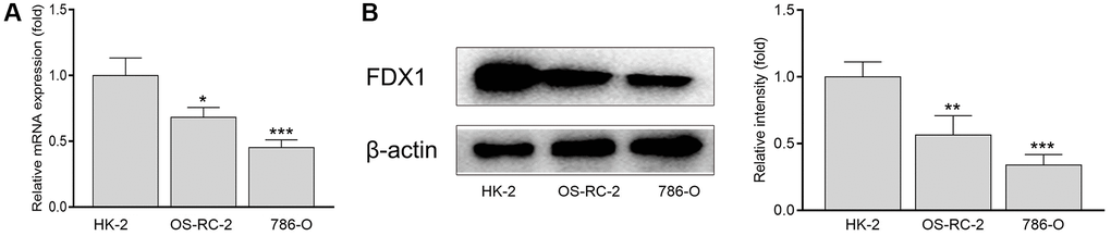 Total RNA was extracted from the clinical samples and renal cancer cells using an RNA extraction kit (ServiceBio, Wuhan, China). The cDNA was synthesized according to the manufacturer’s instructions using a Servicebio® RT First Strand cDNA Synthesis Kit (ServiceBio). The qRT-PCR used 2*SYBR Green qPCR Master Mix (ABclone, Woburn, MA, USA) for real-time quantitative PCR reaction. Overall, there were 40 cycles of denaturation at 95°C for 15 s and annealing/stretching at 60°C for 30 s. The following primers were used for qRT-PCR: FDX1, forward: 5′-CCACTTTATAAACCGTGATGGTG-3′; reverse: 5′-ACATGCACCAAAGCCATCAA-3′. GAPDH, forward: 5′-GGAAGCTTGTCATCAATGGAAATC-3′; reverse: 5′-TGATGACCCTTTTGGCTCCC-3′. GAPDH levels were used to standardize the data. The relative mRNA level of FDX1 was calculated by the 2−ΔΔCt method.