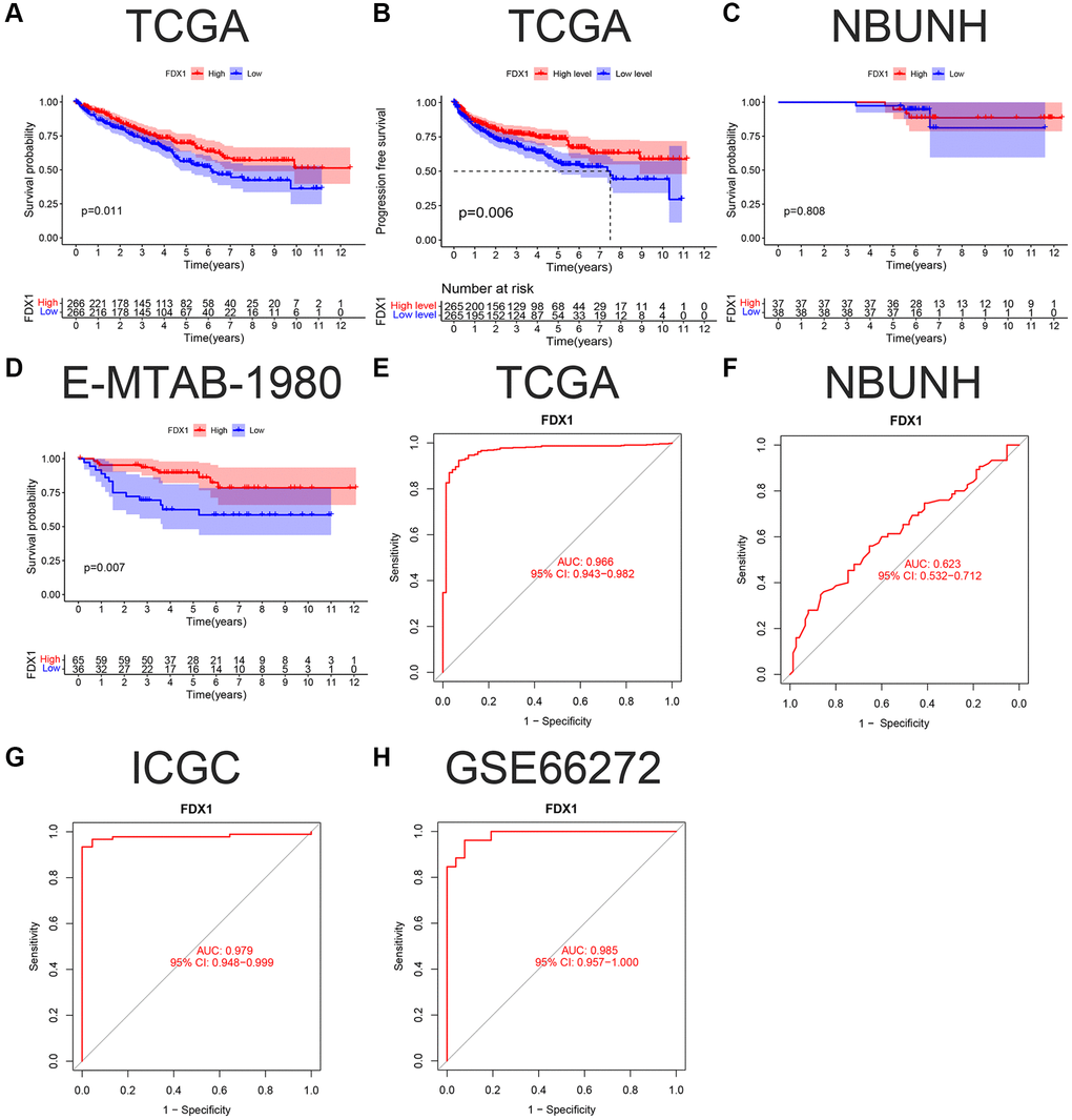 In this study, 532 patients with ccRCC were divided into high- and low-expression groups according to the median FDX1 expression level. Kaplan-Meier curves showed that the overall survival (OS) and progression free survival (PFS) in the low expression group were lower than those in the high expression group (P < 0.05, Figure 4A, 4B). However, there was no significant difference in the survival time in the NBUNH cohort (Figure 4C). In the E-MTAB-1980 dataset, when the best cutoff FDX1 expression level was selected, the OS in the low-expression group was significantly lower than that in the high-expression group (P < 0.01, Figure 4D). With the help of ROC (receiver operation curve) curves, we found that AUC (area under the curve) value of FDX1 was 0.966 (95% CI 0.943–0.982) in TCGA dataset (Figure 4E), 0.623 (95% CI 0.532–0.712) in the NBUNH cohort (Figure 4F), 0.979 (95% CI 0.948–0.999) in the ICGC dataset (Figure 4G), and 0.985 (95% CI 0.957–1.000) in the GEO dataset (Figure 4H).