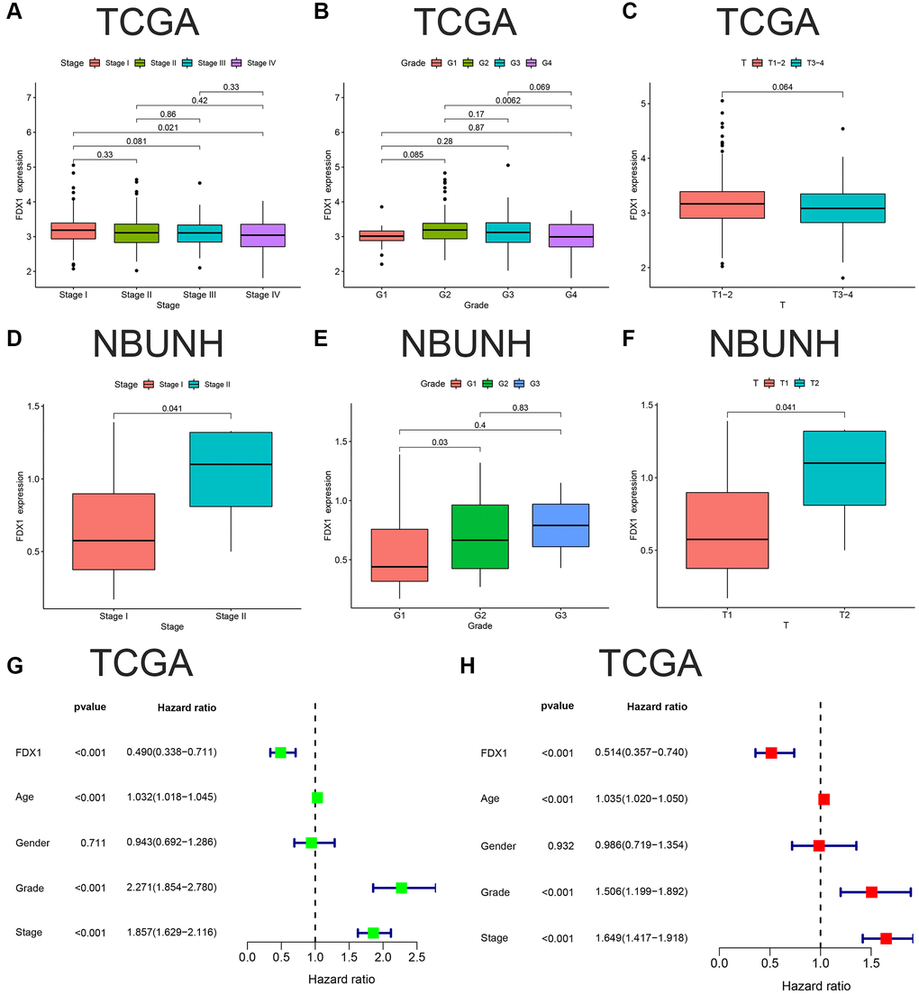 The expression of FDX1 was lower in Stage IV than in Stage I in TCGA dataset (P < 0.05, Figure 5A), and the same was observed in grade 4 compared to grade 2 (P < 0.001, Figure 5B). There was no statistically significant difference between T1–2 and T3–4 (P > 0.05, Figure 5C). Our database (NBUNH) showed that the expression level of FDX1 in Stage II was higher than that in Stage I, G2 was higher than that in G1, and T2 was higher than that in T1 (all P < 0.05, Figure 5D–5F). The correlations between FDX1 expression levels and clinical characteristics from TCGA and NBUNH databases are shown in Table 1. Univariate and multivariate Cox analyses showed that FDX1 could be regarded as an independent prognostic indicator of OS in ccRCC (Figure 5G, 5H).