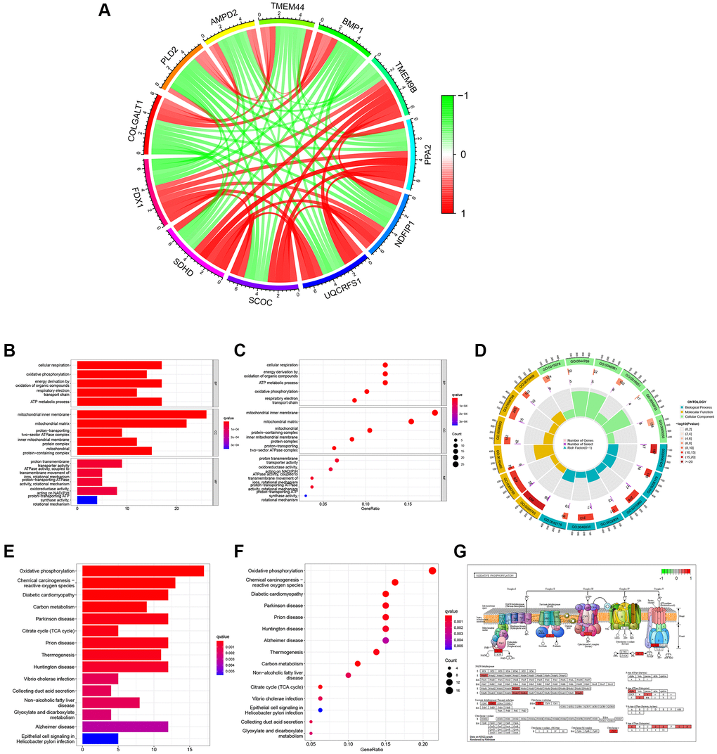 There were 146 genes correlated to FDX1 considering the correlation coefficient >0.5 (Supplementary Table 1). The co-expression circle diagram shows the correlation between FDX1 and the other 11 genes with the largest absolute values of the correlation coefficient (Figure 6A). Gene Ontology (GO) categories included biological processes (BP), cellular components (CC), and molecular functions (MF) (Supplementary Table 2). We discovered that BP mainly contained cellular respiration, CC mainly included the mitochondrial inner membrane, and MF mainly contained the proton transmembrane (Figure 6B and 6C). The circular diagram depicts the top five GO functions (Figure 6D). Oxidative phosphorylation was closely associated with FDX1 expression in Kyoto Encyclopedia of Genes and Genomes (KEGG) (Figure 6E, 6F, Supplementary Table 3). Pathway graphs suggested that the genes correlated with the altered expression of oxidative phosphorylation (Figure 6G).