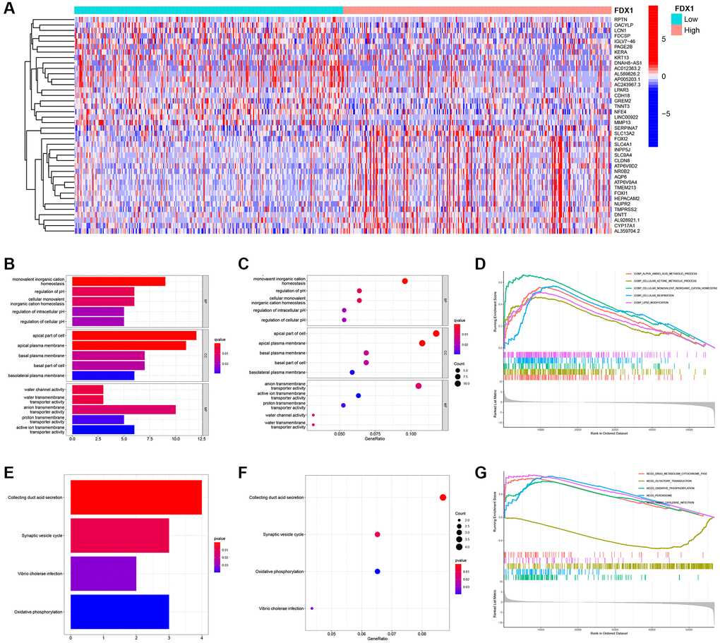 Altogether, 234 differentially expressed genes (DEGs) were screened according to the cutoff values (Supplementary Table 4). A heatmap illustrating the expression of the top 20 DEGs is shown in Figure 7A. GO and KEGG analyses were performed to explore their functions (Supplementary Tables 5 and 6). We mainly found monovalent inorganic cation homeostasis in BP, the apical part of the cell in CC, and the anion transmembrane in MF (Figure 7B, 7C). On the other hand, collecting duct acid secretion and synaptic vesicle cycle of differential genes were enriched in KEGG pathways (Figure 7E, 7F), which was analyzed in “c5.go.v7.4. symbols.gmt” (Supplementary Table 7). The alpha amino acid metabolic process was enhanced when FDX1 was expressed at different levels (Figure 7D). Oxidative phosphorylation and the peroxisome were main pathways after GSEA analysis via “c2.cp.kegg.v7.4. symbols.gmt” (Figure 7G and Supplementary Table 8).