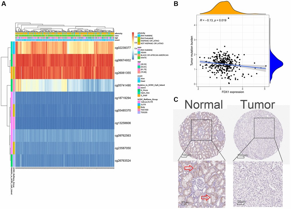 MethSurv (https://biit.cs.ut.ee/methsurv/) was used to evaluate the prognostic value of FDX1 methylation in patients with ccRCC. The Protein Atlas Database (https://www.proteinatlas.org/) was used to display the protein expression level of FDX1. The TMB of FDX1 was calculated based on gene mutation data from TCGA.