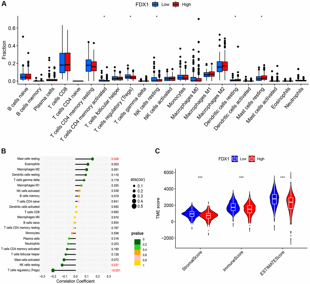 The CIBERSORT method explored 22 types of immune cells, of which five were found to be significantly different (P < 0.05, Figure 9A). In addition, correlation analysis showed that FDX1 was correlated with three types of immune cells (Figure 9B), suggesting that FDX1 could affect immune responses by regulating resting mast cells, resting NK cells, and regulatory T cells (Tregs). TME analysis indicated that stromal, immune, and ESTIMATE scores increased in the FDX1 low-expression group (P < 0.001; Figure 9C).