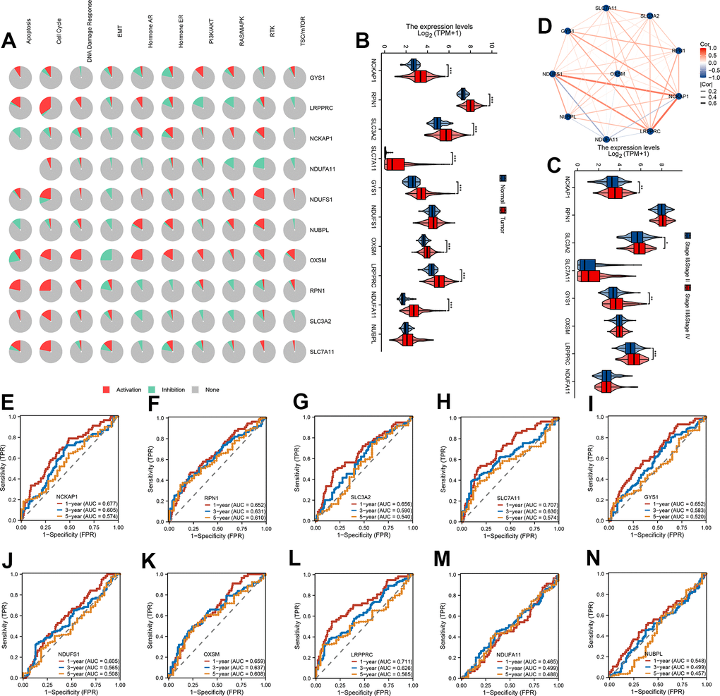 To confirm the biological function of 10 DRG in HCC, we first calculated the cancer major pathway score and then the correlation of 10 DRG with the cancer major pathway score. We found that 10 DRG mainly affects cancer development through the cell cycle pathway (Figure 1A). Next, the expression of 8/10 DRG were highly expressed in HCC except NUBPL and NDUFS1 (Figure 1B). Meanwhile, the expression of NCKAP1, SLC3A2, GYS1, LRPPRC were highly expressed in stage III and stage IV (Figure 1C). We also found that 10 DRG were closely positive correlation except NDUFA11 (Figure 1D). Next, to assess the accuracy of 10 DRG in predicting the prognosis of HCC, we plotted the ROC curves. The 1-year, 3-year, and 5-year AUC of NCKAP1 was 0.677, 0.605, 0.574, RPN1 was 0.652, 0.631, 0.610, SLC3A2 was 0.656, 0.590, 0.540, SLC7A11 was 0.707, 0.630, 0.574, GYS1 was 0.652, 0.583, 0.520, NDUFS1 was 0.605, 0.565, 0.508, OXSM was 0.659, 0.637, 0.608, LRPPRC was 0.711, 0.626, 0.565, NDUFA11 was 0.465, 0.499, 0.488, NUBPL was 0.548, 0.499, 0.457. The 10 DRG exhibited a low AUC area, suggesting that these gene had a worse overall performance (Figure 1E–1N). Therefore, there is an urgent need to develop a more effective model to predict the survival of HCC.