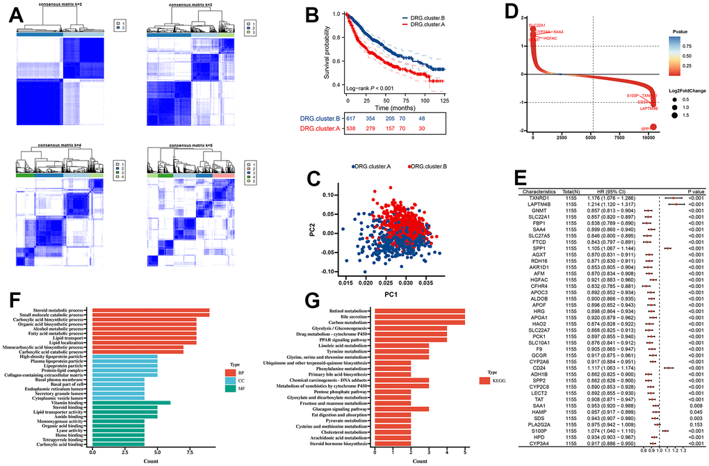 First, we merge TCGA-LIHC, LIRI-JP, GSE14520, GSE36376, and GSE76427 into a meta cohort. The consensus CDF curve and the change in area under CDF delta area curve showed that, for consensus matrix k=2, 9 DRG related expression-based classification had relatively stable clustering results (Figure 3A). We figured out that the OS time of the DRG.cluster.B had better prognosis compared with DRG.cluster.A (Figure 3B). Two clusters such as DRG.cluster.A and DRG.cluster.B were clearly identified (Figure 3C). A total of 40 mRNAs with significant differences between DRG.cluster.A and DRG.cluster.B HCC subtypes (|log2FC|>1; adj. p<0.05) (Figure 3D and Supplementary Table 1). By univariate COX regression analysis, 39 out of 40 genes were significantly associated with survival prognosis (Figure 3E). These genes were mainly enriched in metabolism-related signaling pathways (retinol metabolism, carbon metabolism, linoleic acid metabolism, tyrosine metabolism) (Figure 3F, 3G and Supplementary Tables 2, 3).