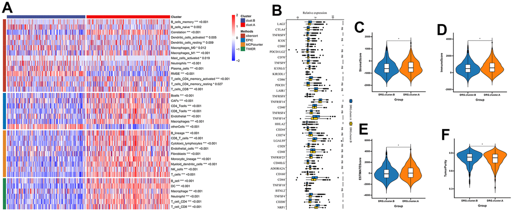 Next, we further explored the immunological role of DRG.cluster in HCC. The results suggested that the infiltration level of most immune cells was significantly lower in DRG.cluster.B group (Figure 4A). In this analysis, we also evaluated some representative targets, and found that immune checkpoint were highly expressed in DRG.cluster.A group (Figure 4B and Supplementary Table 4). The ESTIMATE results showed that the stromal score, immune score and ESTIMATE score in DRG.cluster.A group were much higher than those in DRG.cluster.B group (Figure 4C–4F and Supplementary Table 5).