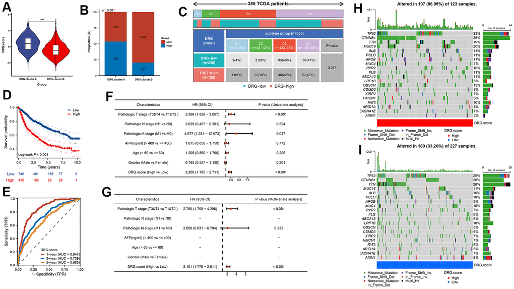 In order to predict the prognosis of HCC patients more accurately, we built DRG.score based on 6 hub gene (Supplementary Table 6). According to the DRG.score distribution, the 2 DRG.cluster group had significant differences. The results suggested that the DRG.score in DRG.cluster.B group were much lower than those in DRG.cluster.A group (Figure 6A), and DRG.cluster.A group had much more high DRG.score patients (Figure 6B). TCGA-based molecular subtypes also showed that the DRG.scores were different for different subtypes (Figure 6C). The OS time curve showed that lower DRG.score subgroup had longer survival time (Figure 6D). The 1-year, 3-year and 5-year AUC of DRG.score was 0.847, 0.739, 0.685 (Figure 6E). The DRG.score exhibited a high AUC area, suggesting that DRG.score had a good overall performance. Meanwhile, univariate and multivariate Cox regression analysis show that DRG.score can be used as an independent factor to predict the prognosis in HCC (Figure 6F, 6G). Also, a lower mutation was discovered in the low DRG.score group (86.99% vs 83.26%) (Figure 6H, 6I). The above results show that the DRG.score can better predict the risk of prognosis.