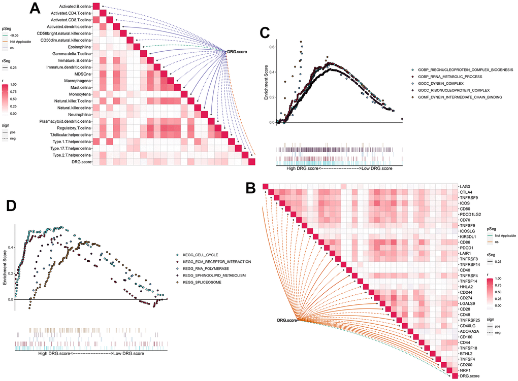 Next, the results figured out that the positive correlation between these immune cells and DRG.score (Figure 7A). The infiltration level of immune cells was significantly lower in low DRG.score group (Supplementary Figure 2). We also found the positive correlations between these immune checkpoints and DRG.score were intricate (Figure7B). In order to examine the underlying biological processes in the high and low DRG.score groups, we performed a GSEA analysis. The results showed that tumor-related pathways (cell cycle, ECM receptor interaction) were enriched in the high DRG.score group (Figure 4C, 4D). These results suggested that high DRG.score may have a significant impact in tumor development.