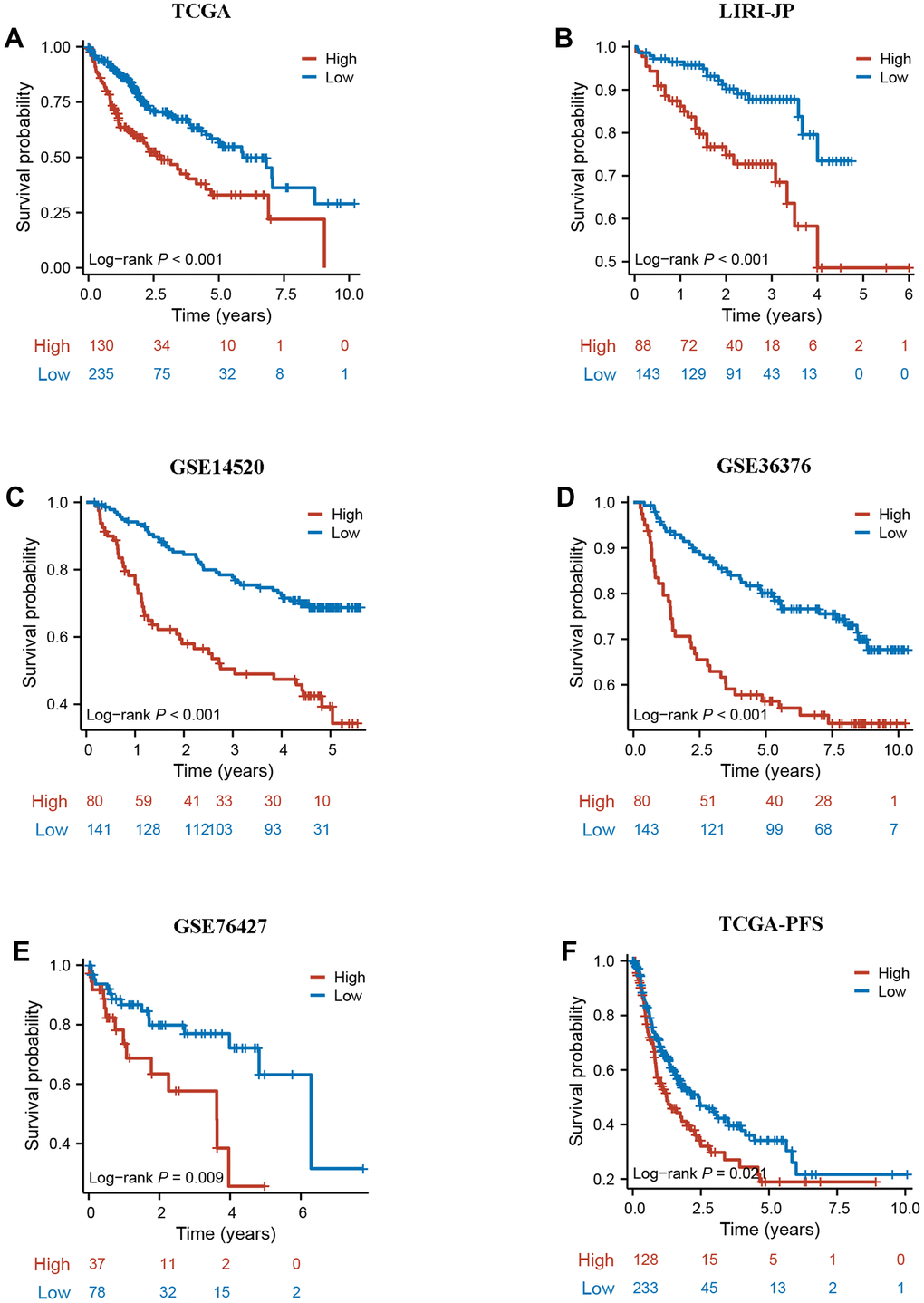 To further validate the robustness of DRG.score, the prognostic implication of DRG.score was examined in multiple independent datasets. In both patient sets, patients in the high DRG.score group had a worse OS than in the low DRG.score group in TCGA-LIHC, LIRI-JP, GSE14520, GSE36376, and GSE76427 (Figure 8A–8E). Meanwhile, patients in the high DRG.score group had a worse progression free survival than in the low DRG.score group in TCGA-LIHC (Figure 8F).