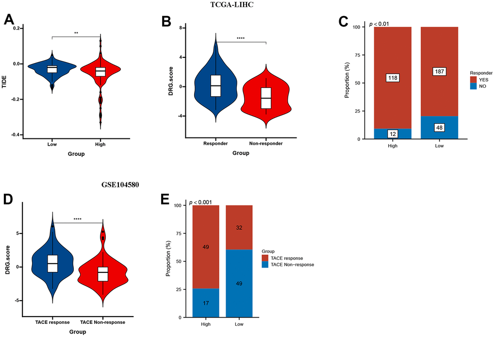 The results showed that low DRG.score group had a higher TIDE score compared with high DRG.score group (Figure 9A). Higher TIDE scores indicate a greater likelihood of immune evasion, suggesting that patients may not benefit from immune checkpoint inhibitor therapy. Meanwhile, responder group had a higher DRG.score than non-responder group (Figure 9B), and high DRG.score group had a higher responder patients compared with low DRG.score group (Figure 9C). Moreover, a higher DRG.score was found in the TACE response group than in the TACE non-response group, and high DRG.score group had a higher TACE responder patients compared with low DRG.score group (Figure 9D, 9E). These results suggested that patients with higher DRG.score demonstrated significant immunotherapy therapeutic advantages and TACE clinical benefits.