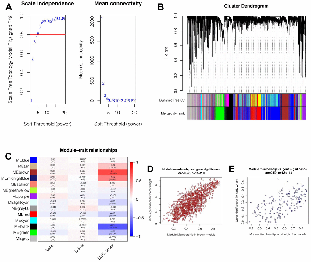 In the TCGA cohort, the LLPS enrichment score of each breast cancer patient was quantified by ssGSEA analysis. Then, WGCNA was used to further find genes related to LLPS phenotype in breast cancer. It was found that when the soft domain value was set to 6, not only R^2>0.8, indicating that the data was in line with power law distribution and suitable for WGCNA analysis, but also mean connectivity tended to be stable (Figure 1A). Then, the minimum number of genes in the module was set as 100, deepSplit = 3, and similar modules were merged by setting cutHight = 0.4, and 14 non-gray gene modules were finally obtained, as shown in Figure 1B. Among these modules, we found that both brown and midnightblue modules had the strongest correlation with LLPS (Cor = 0.71&p<0.001; Cor = 0.49&p<0.001, Figure 1C), suggesting that these two modules are closely related to LLPS in breast cancer. Subsequently, we explored the correlation of genes within the Module and found that, as shown in Figure 1D, 1E, there is a strong positive correlation between Module membership and the importance of genes in brown and midnightblue modules (cor = 0.78&p<0.001; Cor = 0.59&p<0.001). We then selected genes from these modules for subsequent analysis.