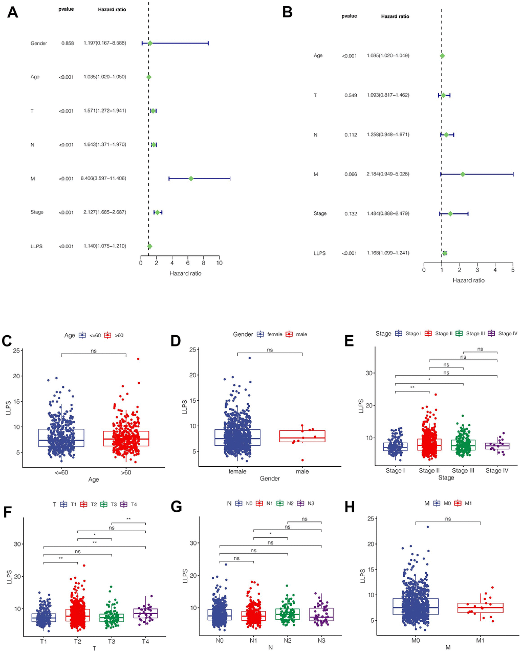 As shown in Figure 4A, we found that Age, T, N, M, Stage and LLPS were all influential factors for the prognosis of breast cancer through univariate COX analysis. However, multivariate COX analysis showed that only LLPS and age were independent prognostic factors (Figure 4B). Subsequently, we explored the relationship between the model and clinical characteristics, and found that, as shown in Figure 4C, 4D, there was no significant difference in LLPS values between different gender and age groups. In terms of clinical staging, LLPS values were higher in Stage II compared to stage I and stage III (Figure 4E). In T stage, the LLPS in T2 stage was higher than that in T1, and the LLPS in T4 stage was also higher than that in T1 and T2 (Figure 4F). In N stage, we found that the LLPS in N2 stage was higher than that in N1 stage (Figure 4G). However, there was no significant difference in LLPS value in M stage (Figure 4H).
