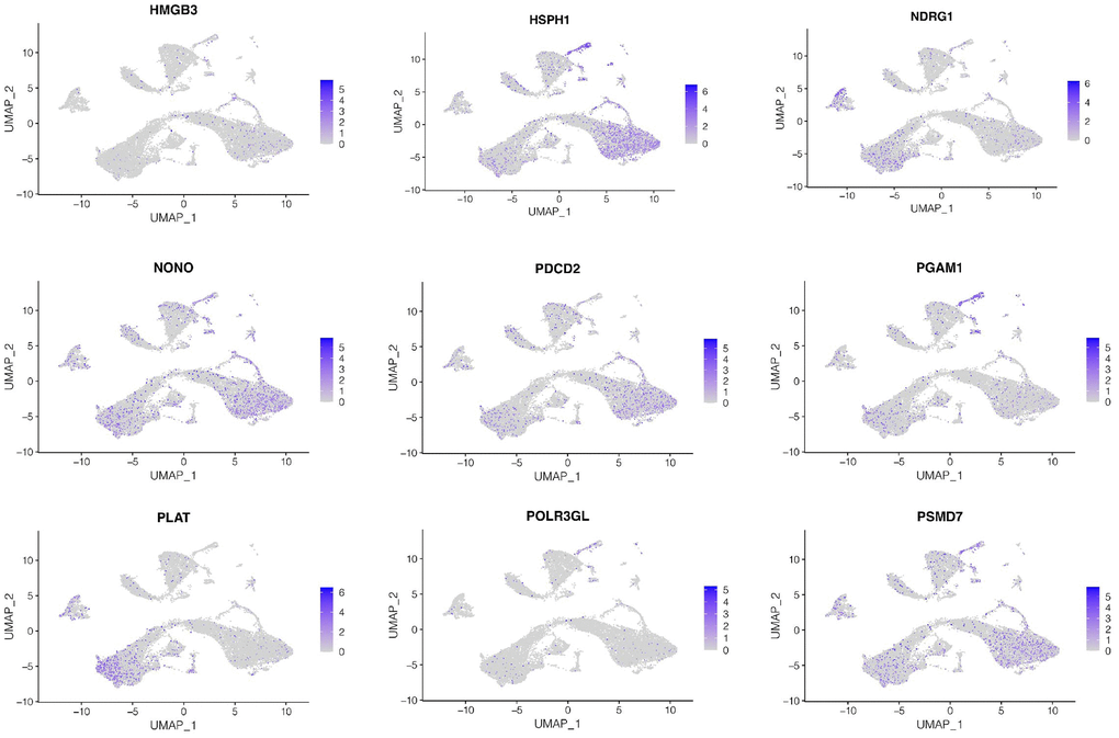 Subsequently, we investigated expression of genes in the model at the single-cell level. As shown in Figure 6, we found that HMGB3 and HSPH1 were mainly expressed in luminal epithelial cells, NDRG1 and PLAT were mainly expressed in stroma cells, while NONO, PDCD2, PSMD7, PAGM1 were mainly expressed in luminal epithelial cells and stroma cells, while POLR3GL was low in all cell types.