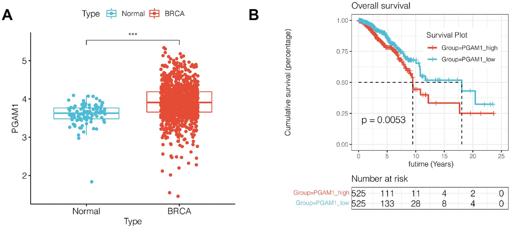 The significance of PGAM1 in cancer biology and immunology suggests its potential as a therapeutic target. Inhibiting PGAM1 activity or targeting its downstream signaling pathways may represent a promising approach to disrupt tumor metabolism, enhance chemosensitivity, and modulate immune responses in cancer. In our study, the function of PGAM1 was verified in vitro. Although we lack in vivo experimental verification, it can still provide reference for prognosis assessment and diagnosis of breast cancer.