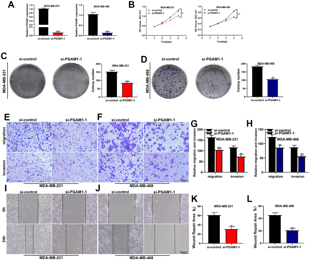 After the breast cancer cell lines MDA-MB-231 and MDA-MB-468 were transfected with three siRNA, the PCR experiment found that si-PGAM1-1 had the highest knockdown efficiency, so the cell experiment was carried out in this group. PGAM1 was significantly knocked down in both two cell lines (Figure 8A). CCK-8 assay showed that the activity of MDA-MB-231 and MDA-MB-468 breast cancer cell lines was significantly decreased after PGAM1 knockdown (Figure 8B). Clonal formation experiments showed that after PGAM1 knockdown, the proliferation ability of MDA-MB-231 and MDA-MB-468 breast cancer cell lines was significantly reduced (Figure 8C, 8D). Transwell assay showed that the migration and invasion of MDA-MB-231 and MDA-MB-468 cell lines were significantly reduced after PGAM1 knockdown (Figure 8E–8H). Wound healing experiments showed that the healing abilities of MDA-MB-231 and MDA-MB-468 cell lines were significantly reduced after PGAM1 knockdown (Figure 8I–8L) (*p<0.05, **p<0.01, ***p<0.001).