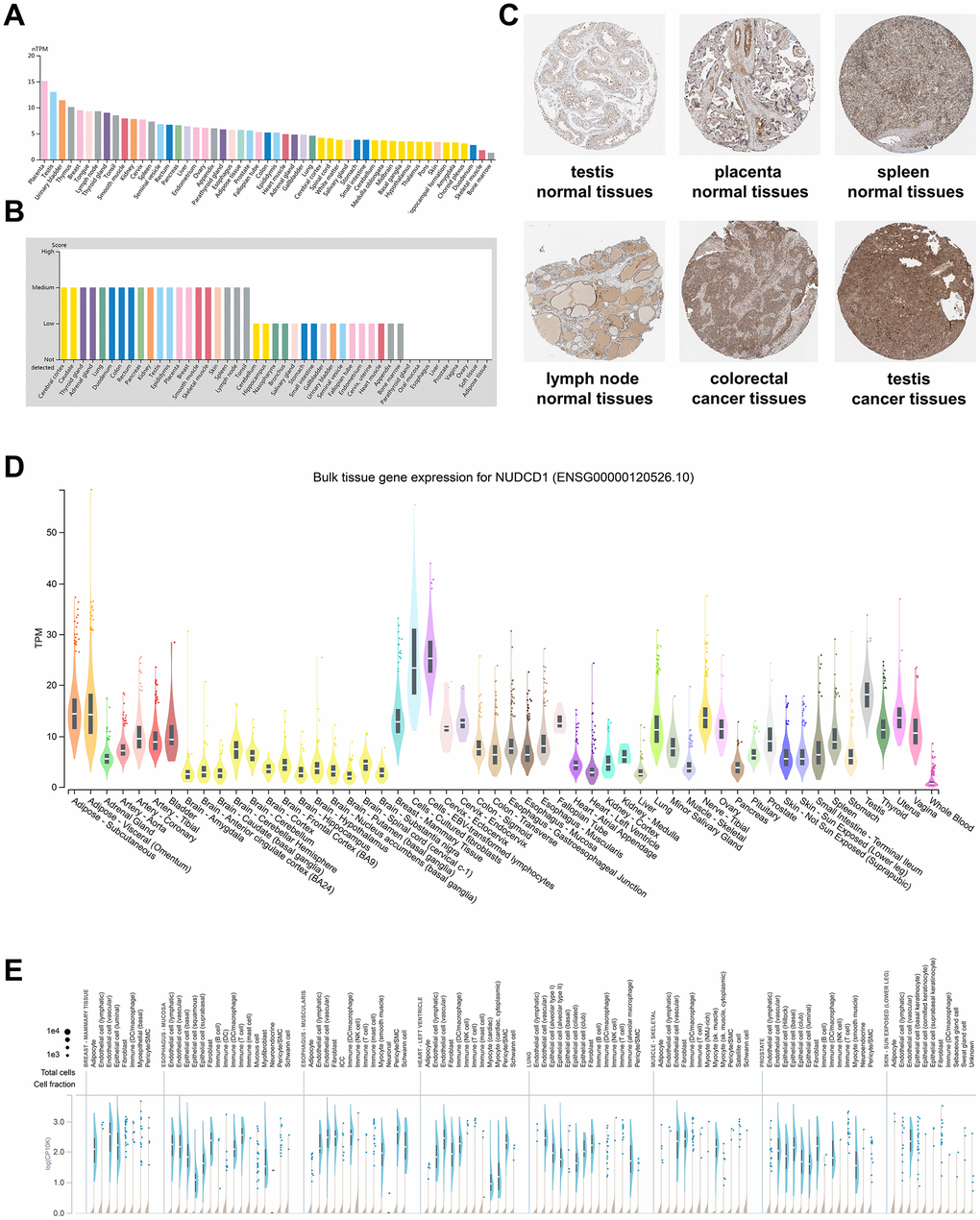 To detect the mRNA and protein expression profiles of NUDCD1 in human normal and cancer tissues, the NUDCD1 expression data for normal tissues were evaluated using the HPA database. An overview of NUDCD1 mRNA and protein expression data indicated that NUDCD1 distribution possessed only a low tissue specificity (Supplementary Figure 1A). NUDCD1 exhibited high mRNA expression levels in placenta, testis and urinary bladder (Figure 1A). The NUDCD1 mRNA expression in GTEx (Genotype-tissue expression), FANTOM5 (Function annotation of the mammalian genome 5) and consensus dataset (dataset created by combining the HPA and GTEx) was shown in Supplementary Figure 1B–1D. NUDCD1 protein expression was widely expressed with medium-low levels in most normal tissues (Figure 1B) and was primarily located in the nucleoplasm and cytosol (Figure 1C). Moreover, NUDCD1 was expressed in several cancers including testicular and colorectal cancer (Figure 1C). The bulk tissue gene expression from GTEx analysis revealed that NUDCD1 was highly expressed in cultured fibroblasts and EBV-transformed lymphocytes but expressed at only low levels in whole blood (Figure 1D). Single cell snRNA-seq single tissue expression for NUDCD1 was shown in Figure 1E. NUDCD1 possessed 4 isoforms (ENST00000521439.1, ENST00000427660.6, ENST00000519607.5 and ENST00000239690.8) differentially expressed in tissues (Supplementary Figure 1E) and the junctions and exon expression levels were defined for these isoforms (Supplementary Figure 2A, 2B). NUDCD1 immune cell expression indicated a low cell type-specificity (Supplementary Figure 2C–2E) and NUDCD1 expression was elevated in extracellular vesicles found in urine and lowest in the glomerular basement membrane (Supplementary Figure 2F).
