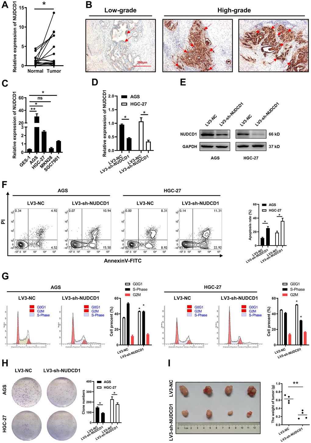 To further validate our results, we examined NUDCD1 mRNA and protein expression using STAD and pericarcinous tissues. We found that the mRNA expression of NUDCD1 was significantly higher than that in pericarcinous tissues (Figure 10A); moderate and strong staining of NUDCD1 was mainly observed in high-grade STAD tissues, while most of the low-grade tumor tissues showed weak staining (Figure 10B). Among the five human cell lines (CES-1, AGS, SGC7901, MKN28 and HGC-27), NUDCD1 showed highest expression in AGS and HGC-27 (Figure 10C). Next, stably NUDCD1-knockdown or NC AGS and HGC-27 cells were constructed and validated (Figure 10D, 10E). Based on above, NUDCD1 was correlated with the cancer-related pathways of apoptosis and cell cycle in STAD (Figure 9F), so we detected the apoptosis and cycle in AGS and HGC-27 cells. Results showed that NUDCD1-knockdown increased the percentage of apoptotic STAD cells (Figure 10F); moreover, elevated the proportion of cells in G0/G1 phase and decreased proportion of cells in S phase were also observed in the comparison to negative control (Figure 10G). As expected, colony formation assays revealed that NUDCD1 knockdown significantly decreased the formation capacity in vitro (Figure 10H). Consistent with that, to knockdown NUDCD1 in vivo could significantly suppress the carcinogenesis of STAD cells in nude mice (Figure 10I).
